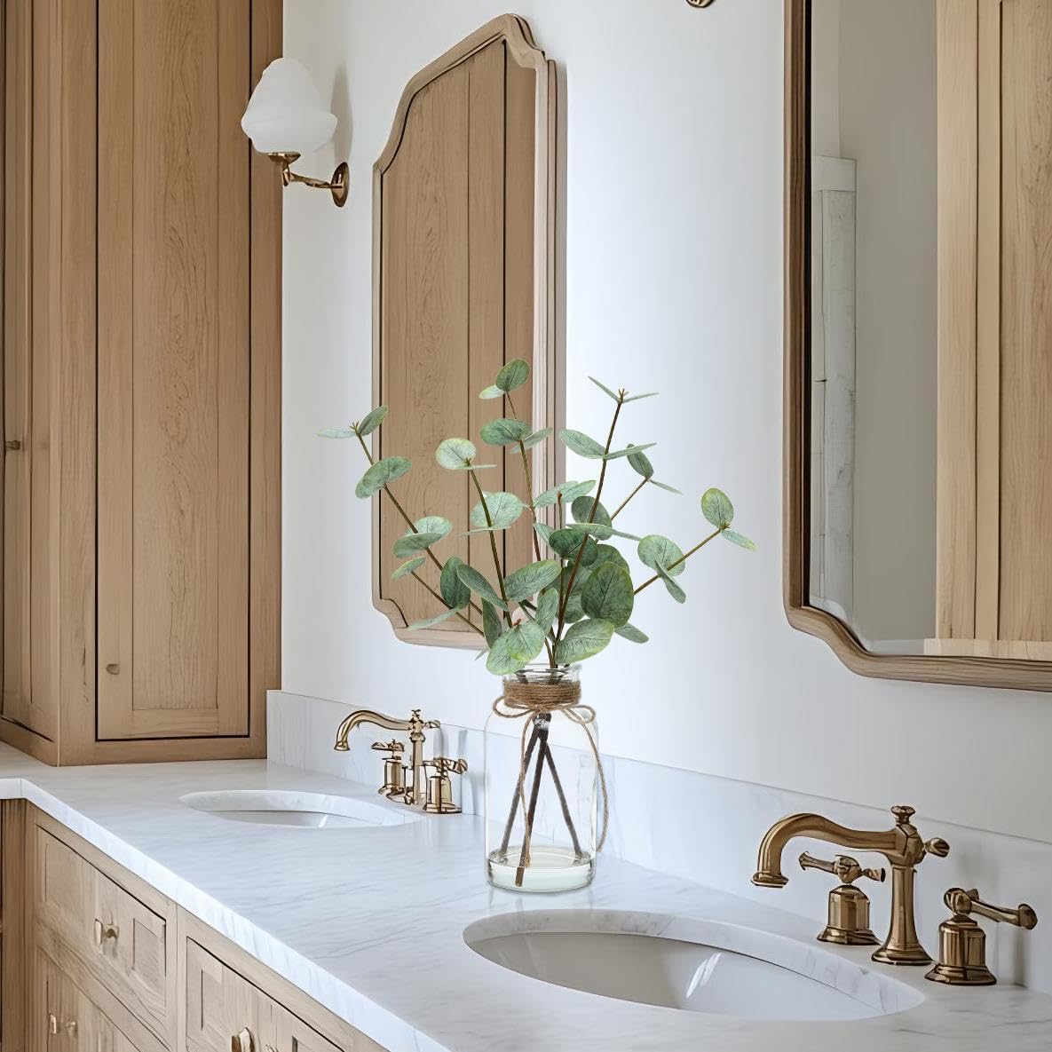 【Crystal-Clear Glass Vase with Fake Water】The eucalyptus stems are artfully organized in a clear glass vase, full with fake water on the base for a convincing fresh-picked look. The mix of readability and greenery provides sophistication to any fashionable or rustic setting.