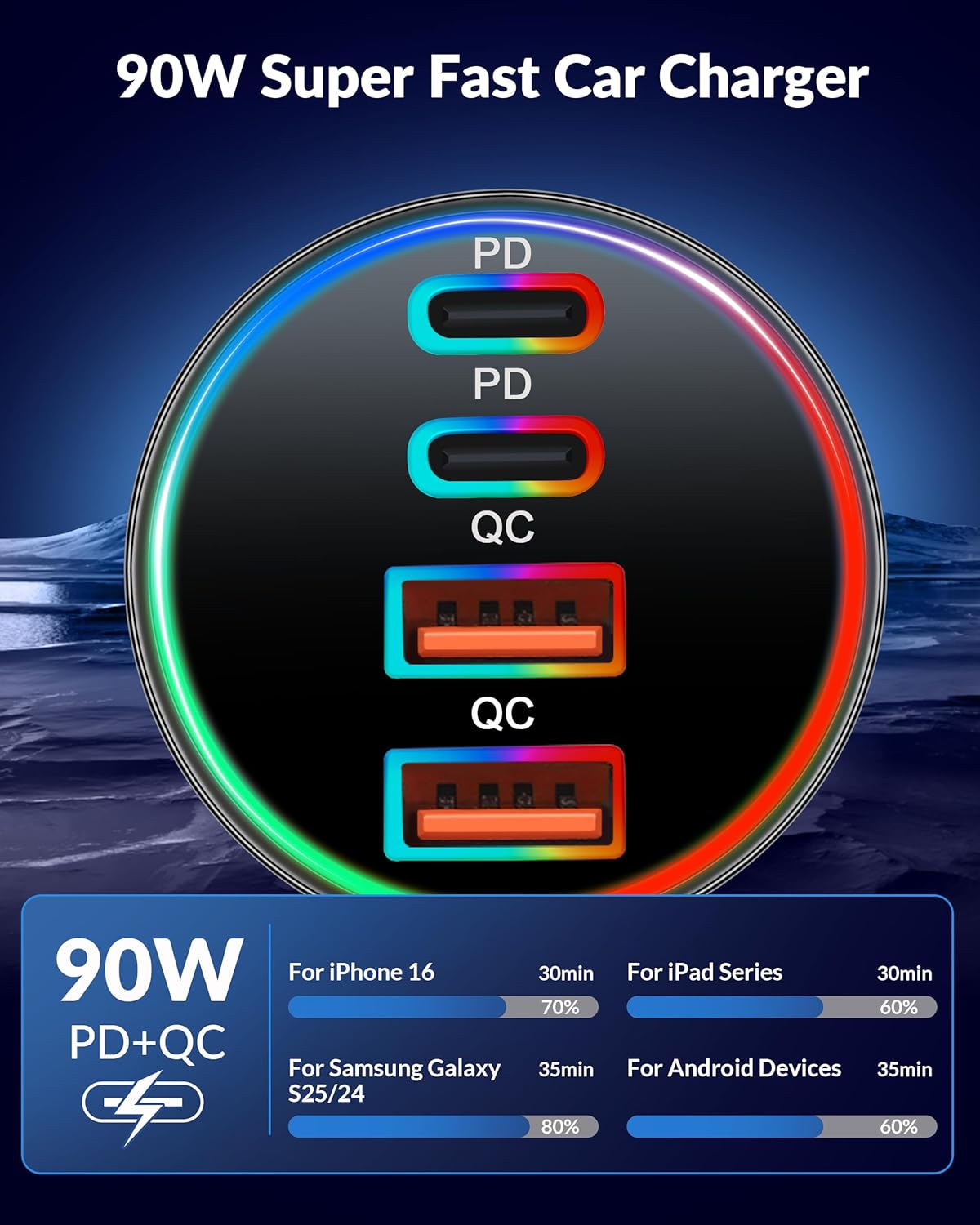 90W Tremendous Quick Charging: Automotive cellphone charger with [2025] upgraded PD/PPS/QC quick charging know-how, 90W Energy charging for iPhone/iPad/Mac Ebook/Android Units. Cost for iPhone 16/15 sequence as much as 70% and iPad sequence as much as 60% in simply half-hour. And cost for Samsung Galaxy S25/S24 sequence as much as 80% and most Android units as much as 60% in 35 minutes