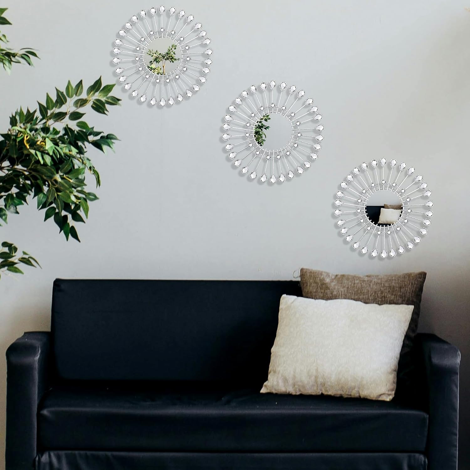 3 PCS Metal Sunburst Mirrors for Wall, Decorative Rhinestones Starburst Wall Mirrors Home Décor, Metal Wall Art for Living Room Bedroom Entryway (Silvery)