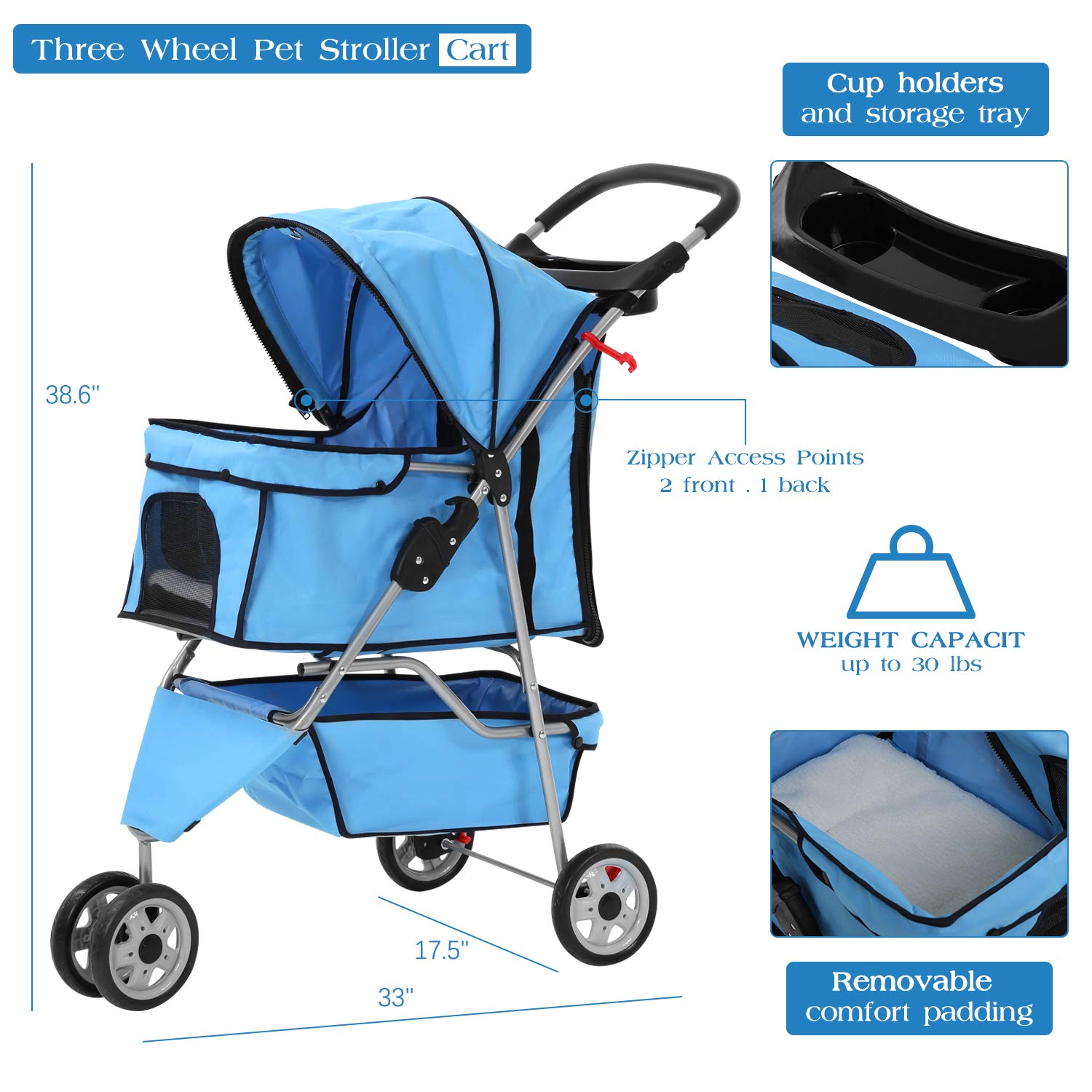 STORAGE & SAFETY: 360 Swivel wheels / Rear wheels with brakes / Outfitted with twin cup holder and tray, storage basket / Security locking wheels / Safety Straps / Appropriate for pets below 30 lbs. FULLY COLLAPSIBLE Coated in SOFT & SUPPLE Materials.