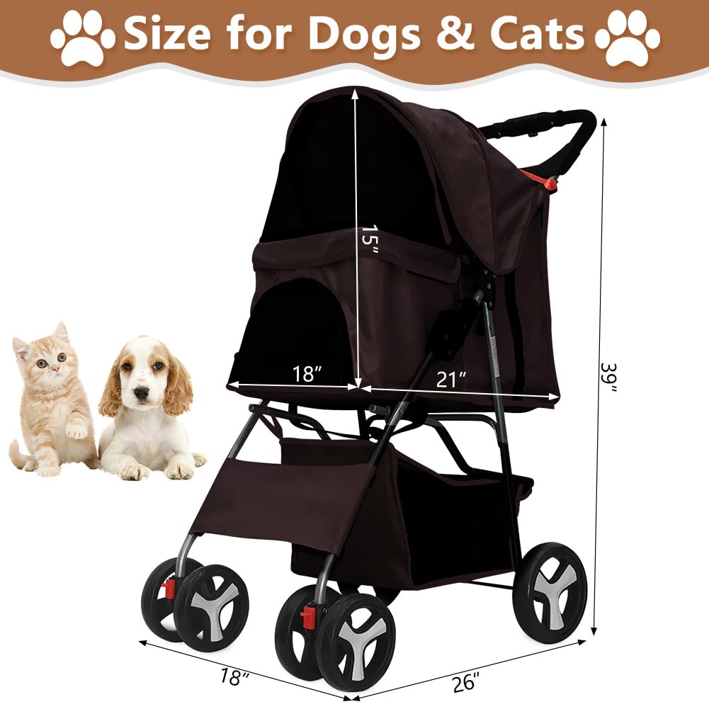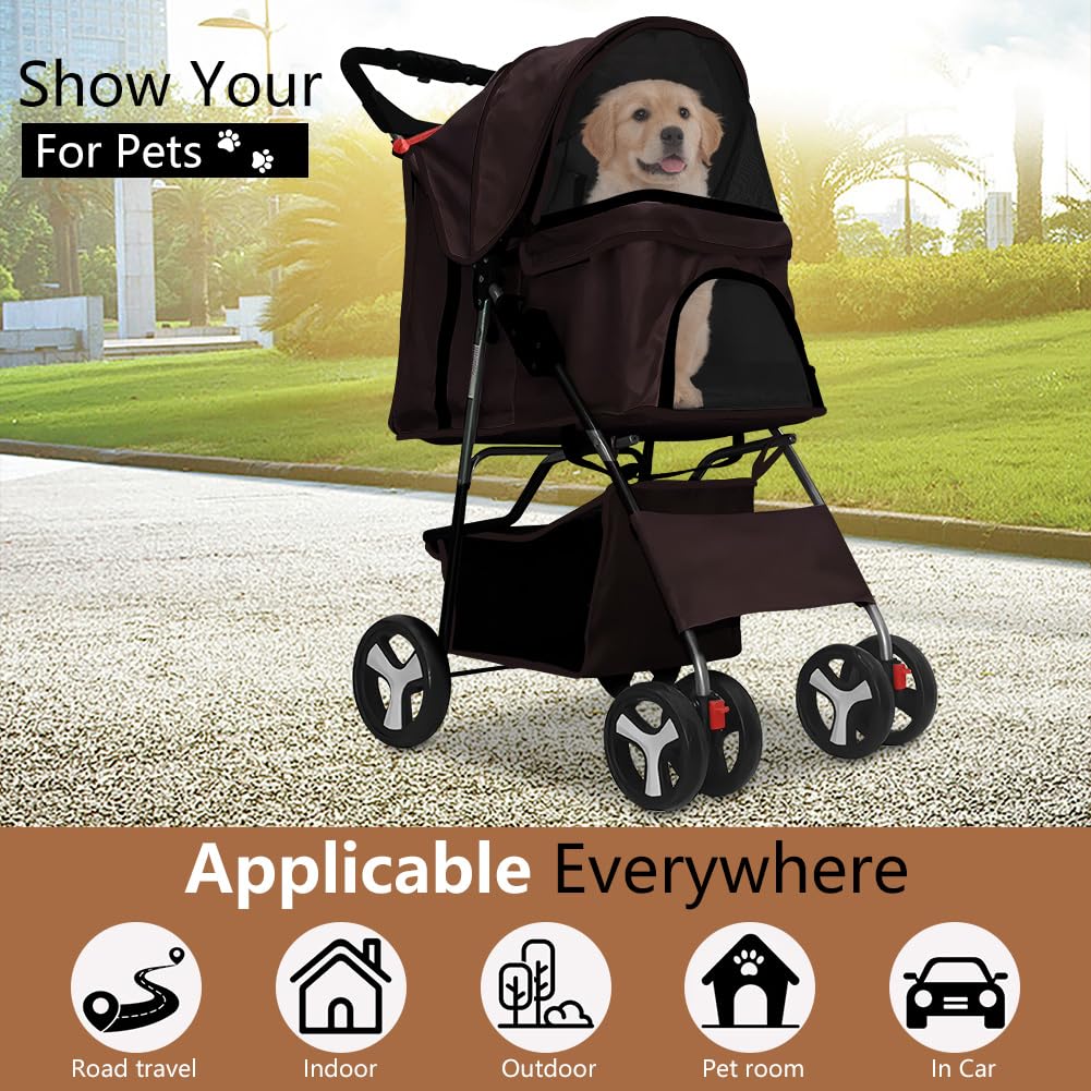 4-Wheel Foldable Pet Stroller for Dogs & Cats – Lightweight Travel Carrier with Cup Holder, Storage Basket & Smooth Ride – Perfect for Walks, Vet Visits (Brown, 4 Wheels)