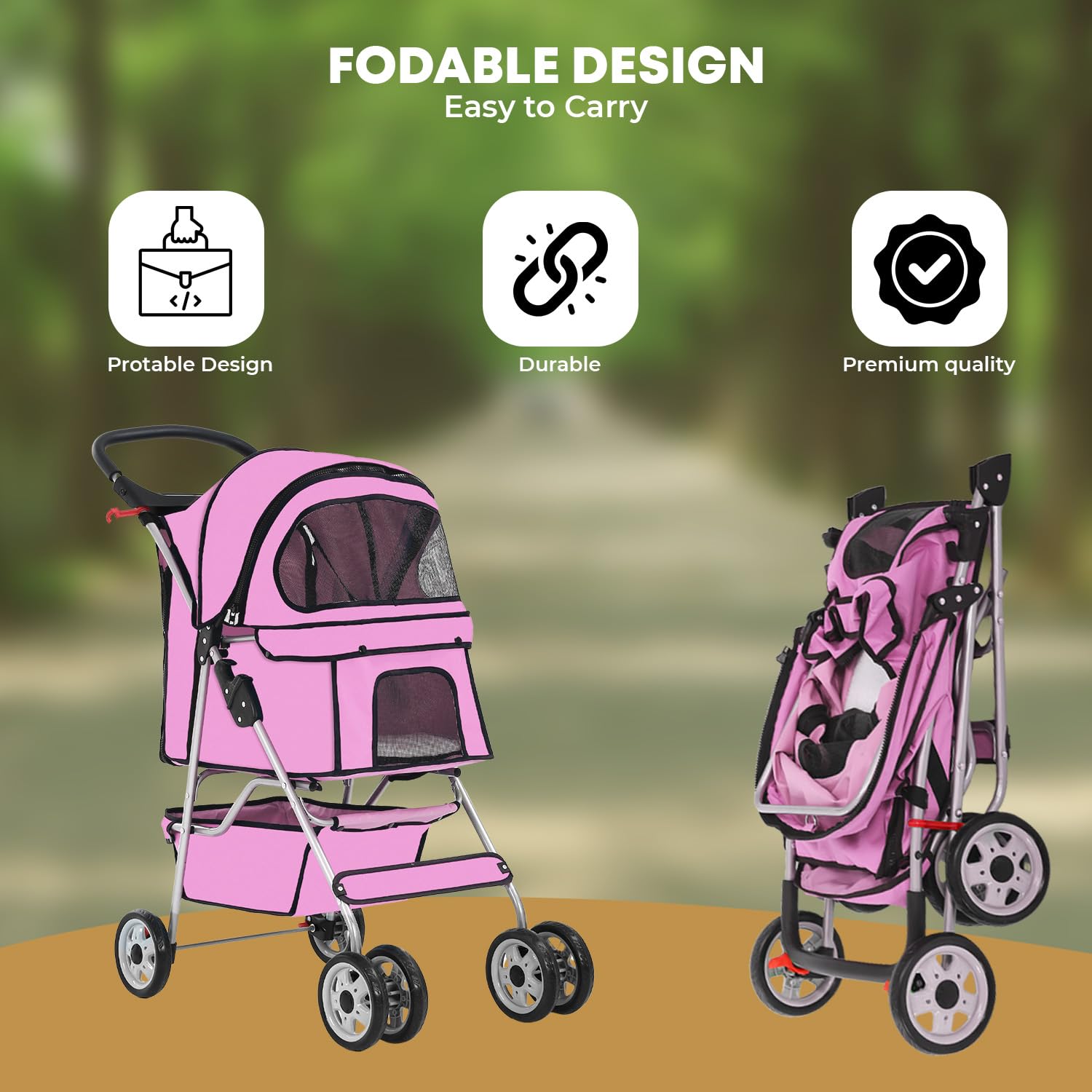 4 Wheels Dog Stroller for Medium & Small Dogs, Cat Stroller with Liner, Storage Basket & Cup Holder, Travel Folding Carrier with Sun Shade – Pink