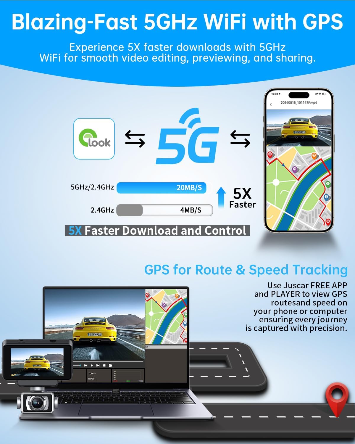 【Constructed-in 5G WiFi & GPS Automotive Digicam】Android and iOS customers can simply connect with the Juscar wi-fi sprint cam through 5G WiFi, The GPS precisely tracks routes and velocity, offering entry to movies, GPS information, and settings in your smartphone at 5x the velocity of normal WiFi. You may as well share your driving expertise in actual time with associates and insurance coverage firms, offering key proof when wanted.