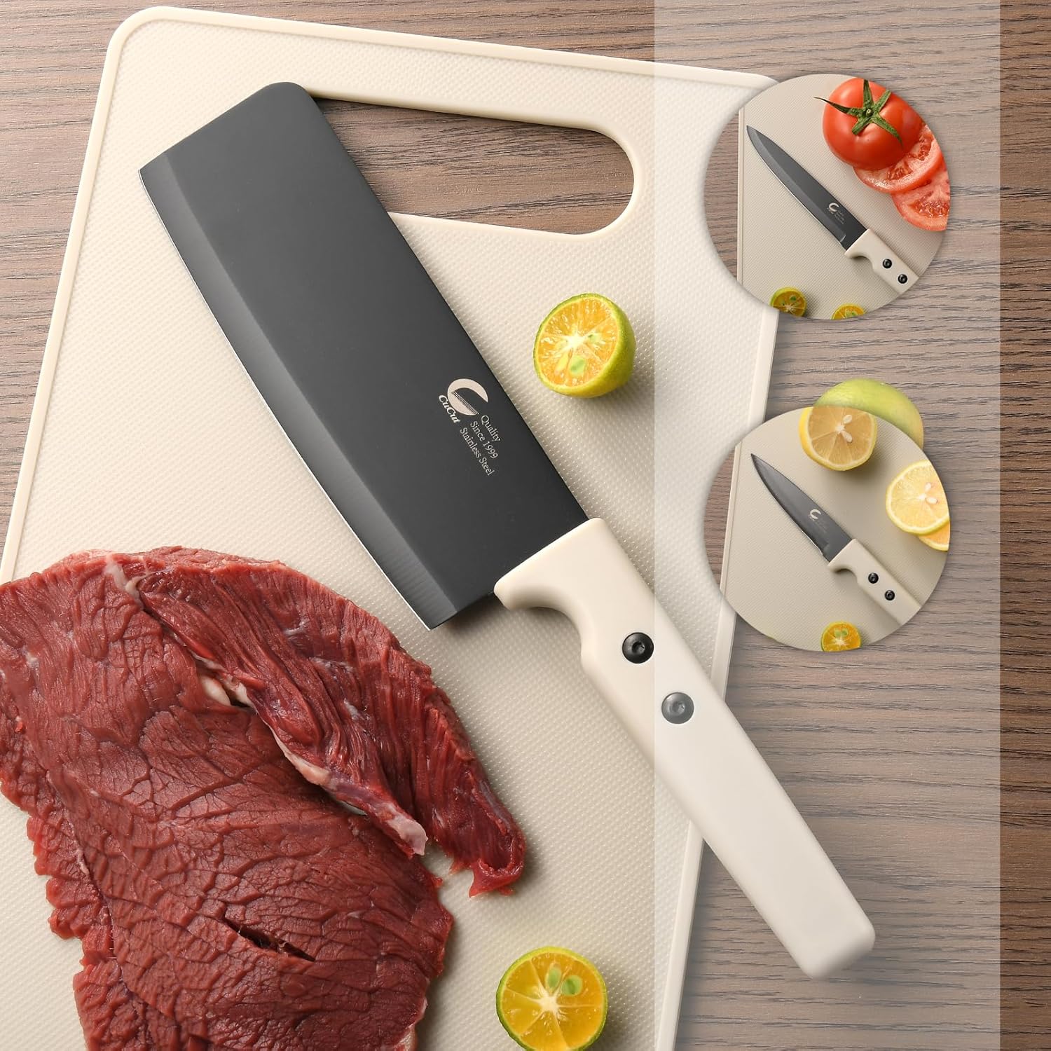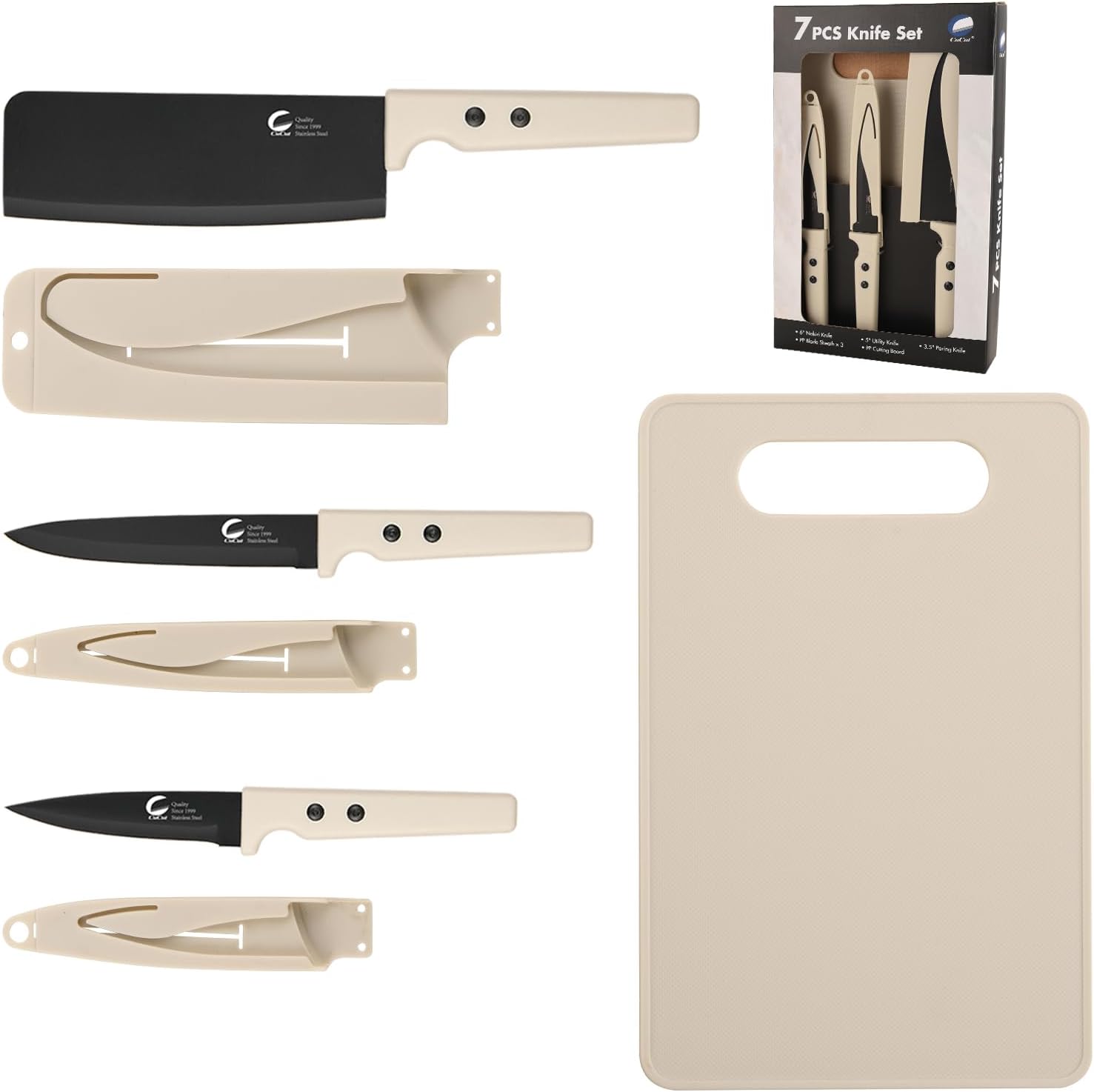 【Complete 7-Piece Kitchen Knife Set】Uncover the last word culinary companion with the CuCut 7-Piece Kitchen Knife Set. This versatile assortment consists of important stainless-steel knives, every meticulously designed to reinforce your cooking expertise. The set contains a 6″ Meat Cleaver, 5″ Utility Knife, 3″ Paring Knife, and features a 7.5 x 11.4-inch reducing board.
