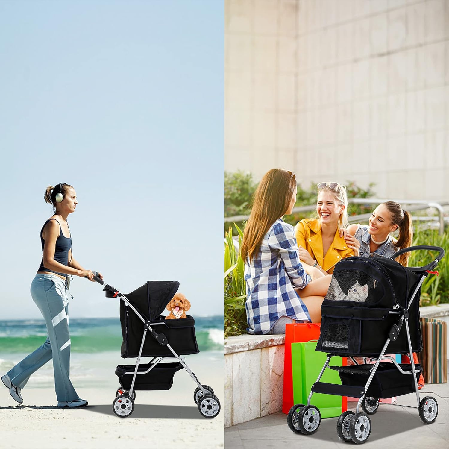 Best 4 Wheels Pet Stroller for Dog & Cat, Lightweight and Foldable Dog Jogger Stroller W/Cup Holders for Small & Medium Pets – Black