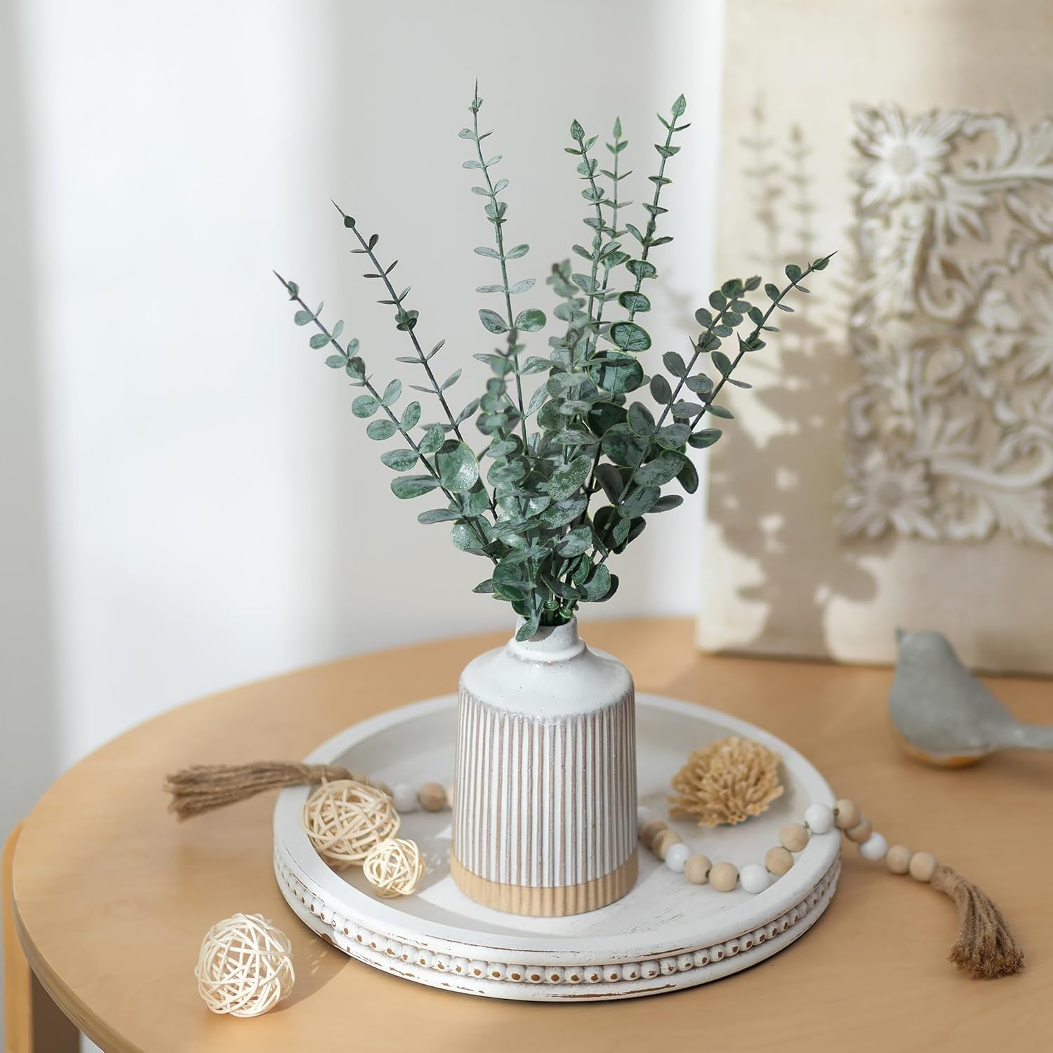 Eucalyptus in Cute Boho Vase: The ceramic vase’s elegant vertical ridges and shiny glaze completely complement the realistic-looking white-powder-treated eucalyptus stems for a very eye-catching show. The impartial white and tan colours of the farmhouse vase for seamlessly mix in with any decor, making it the proper accent piece for any house