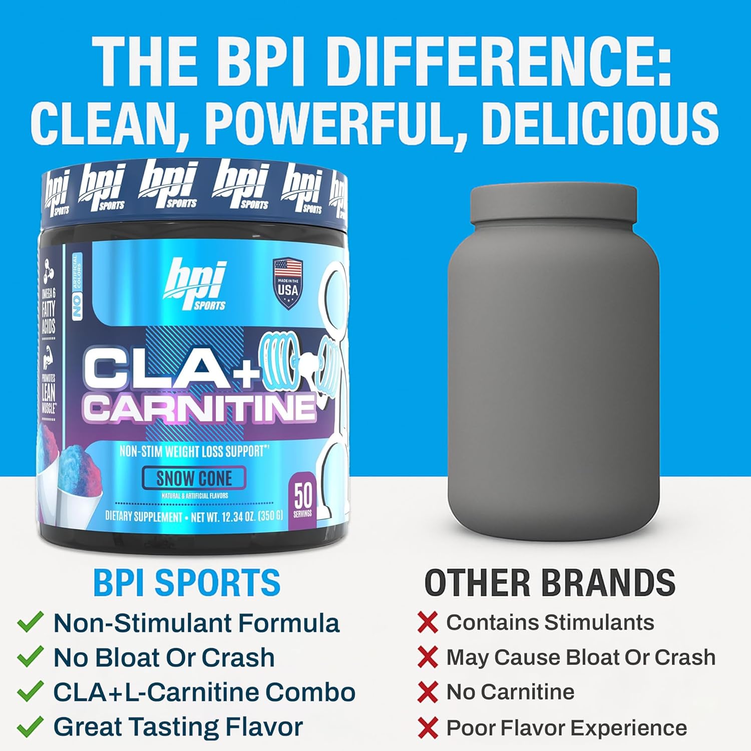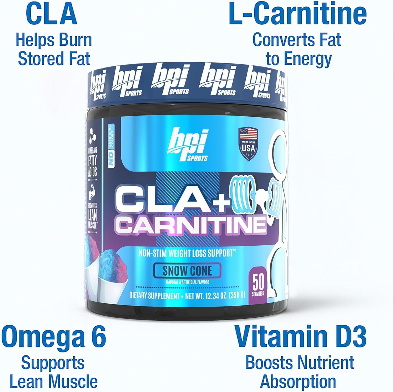 BPI Sports activities CLA + Carnitine is a examined and trusted non-stimulant weight reduction complement that not solely helps enhance efficiency, but additionally improves metabolism, and is available in a scrumptious Snow Cone taste.* CLA and carnitine are two fashionable substances which were clinically proven to assist with weight administration. These two substances work synergistically to assist burn saved physique fats, changing it to vitality.* Not solely does BPI Well being CLA + Carnitine combine simply in ice water, however this scrumptious Snow Cone taste is each crisp and refreshing.