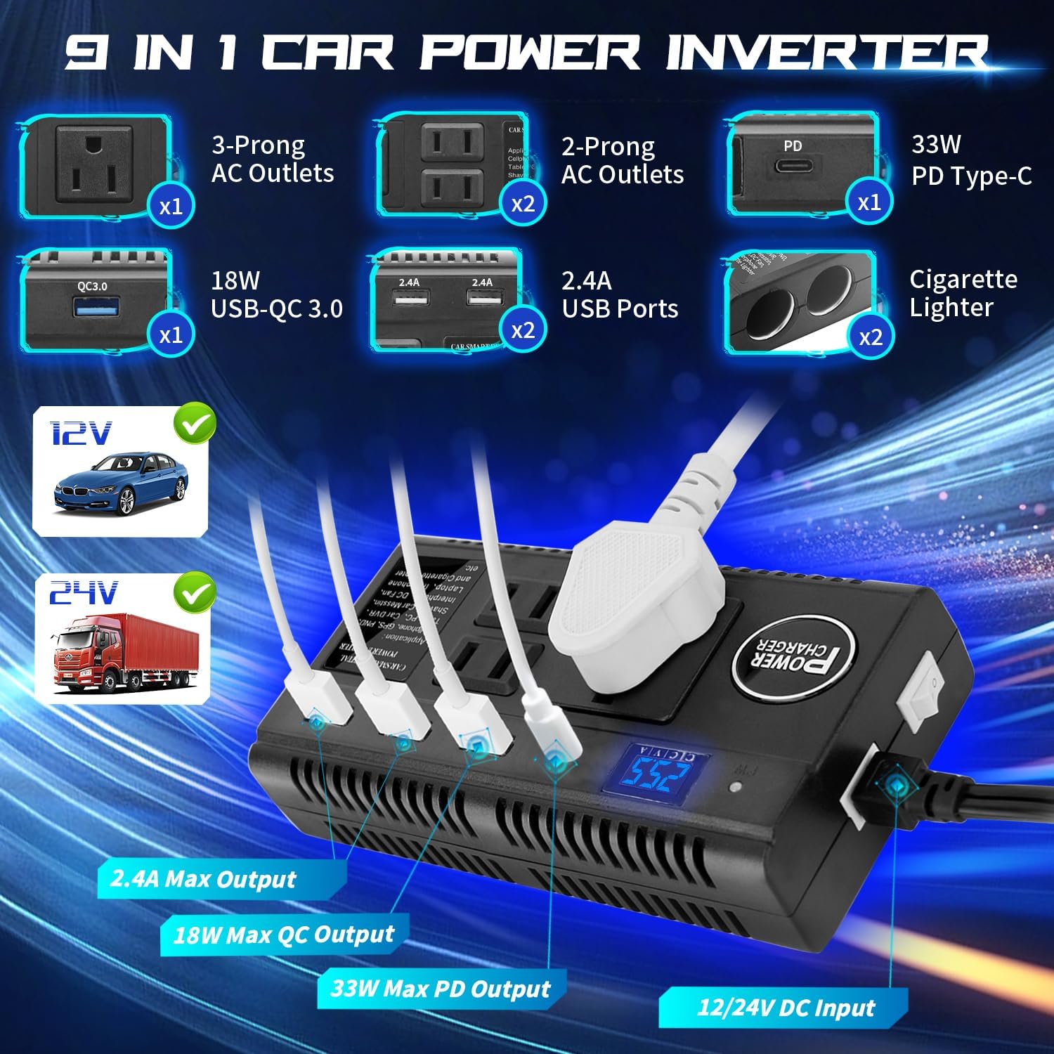 【Upgraded Model】 DC TO AC Inverter – Sensible common energy inverter, each apply in your automobile DC 12V OR your truck/Automobile 24V to AC 110V. Generally bought out there is barely a single voltage automobile inverter, However our merchandise Help DC 12V and 24V enter.In addition to, This automobile energy converter comes with QC 3.0 quick charging, solely half-hour from 0 to 80% , 200% sooner than regular charger.