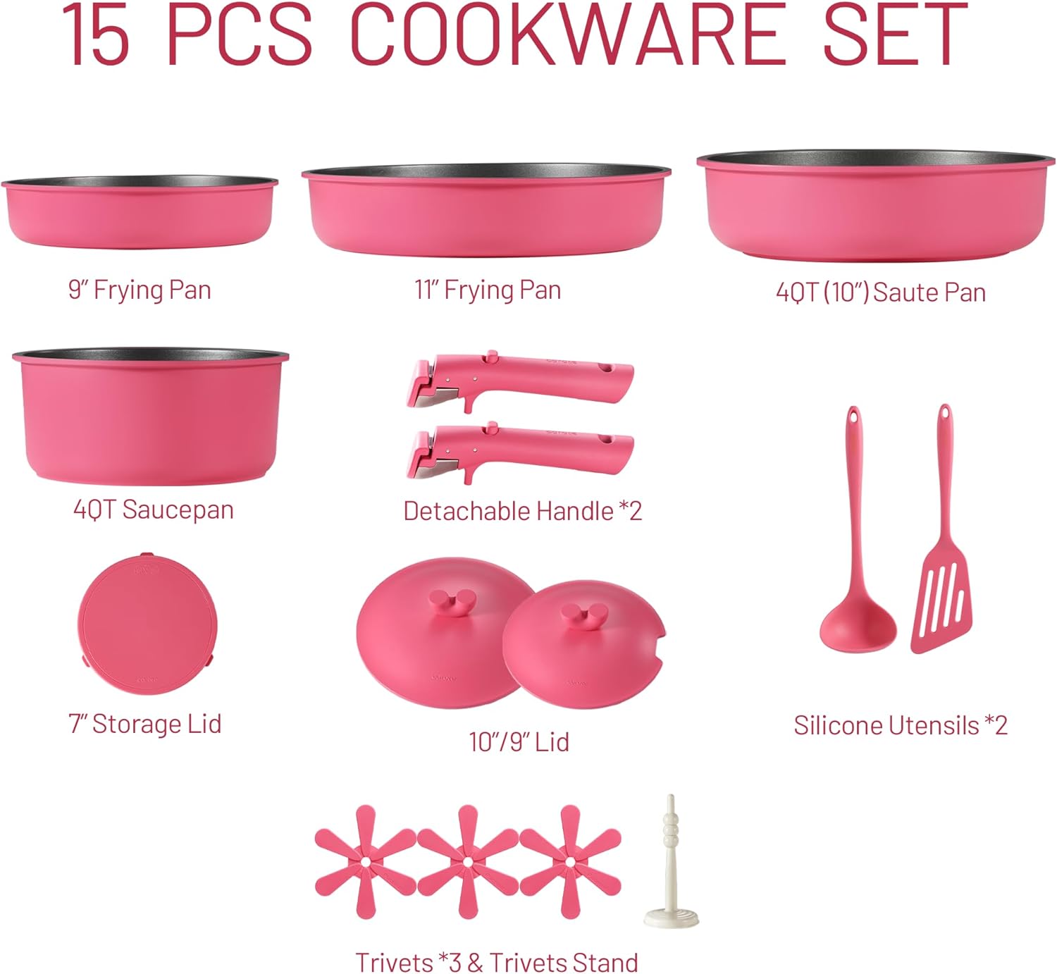 Set Contains: 8.5″ fry pan, 11″ fry pan, 4-qt saucepan with lid, 3.5-qt sauté pan with lid, 4*trivets, fish turner, ladle.