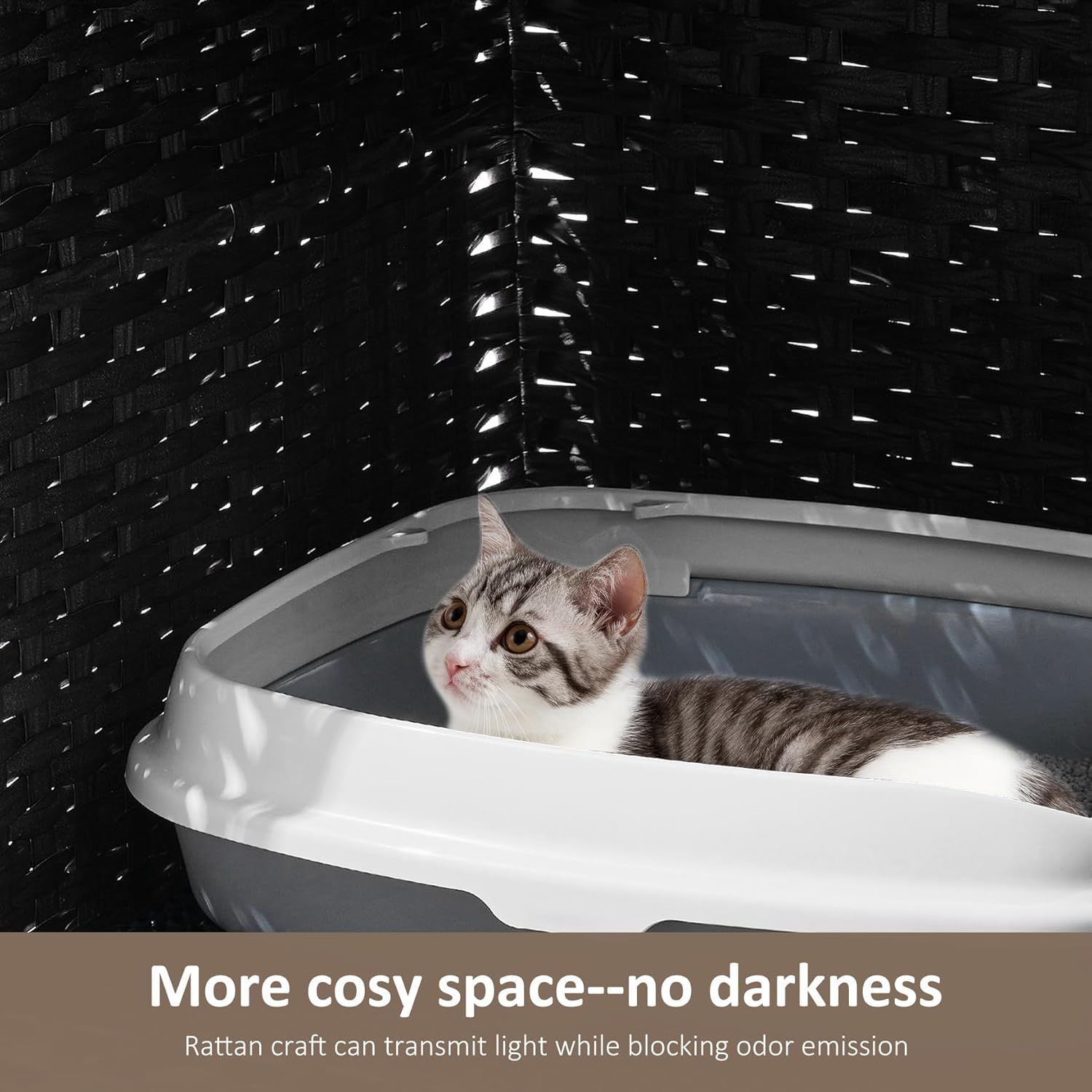【Extra sunshine, Much less odor】 The cat litter field enclosure presents a personal place the place cats really feel secure to reply nature’s name. The rattan cat litter field enclosure can transmit gentle, permitting cats to benefit from the sunshine whereas blocking odor emission.