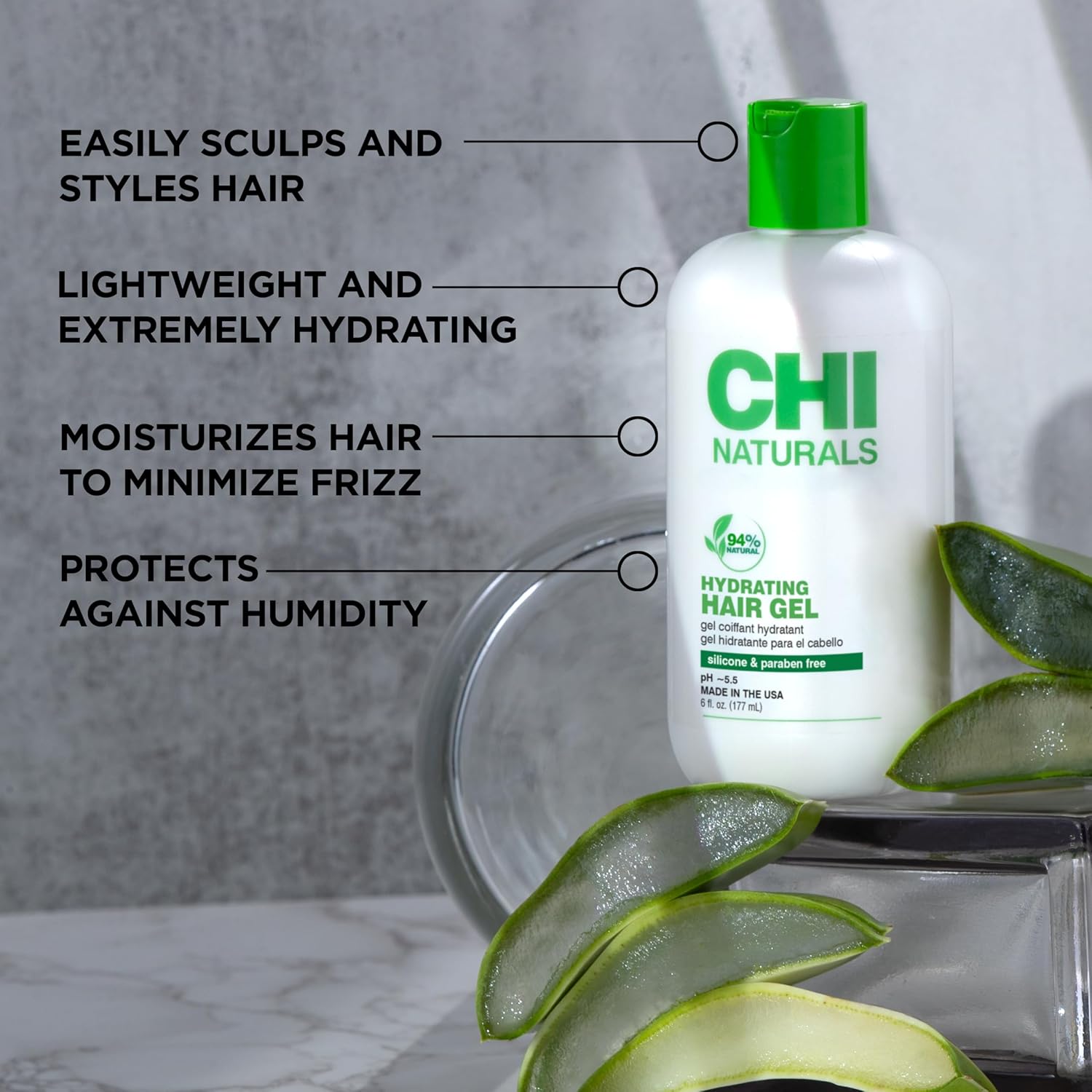 CHI Naturals with Aloe Vera Hydrating Hair Gel, Defines Curls, Lightweight & Controls Frizz, Sulfate, Paraben, & Cruelty-Free, 6 oz
