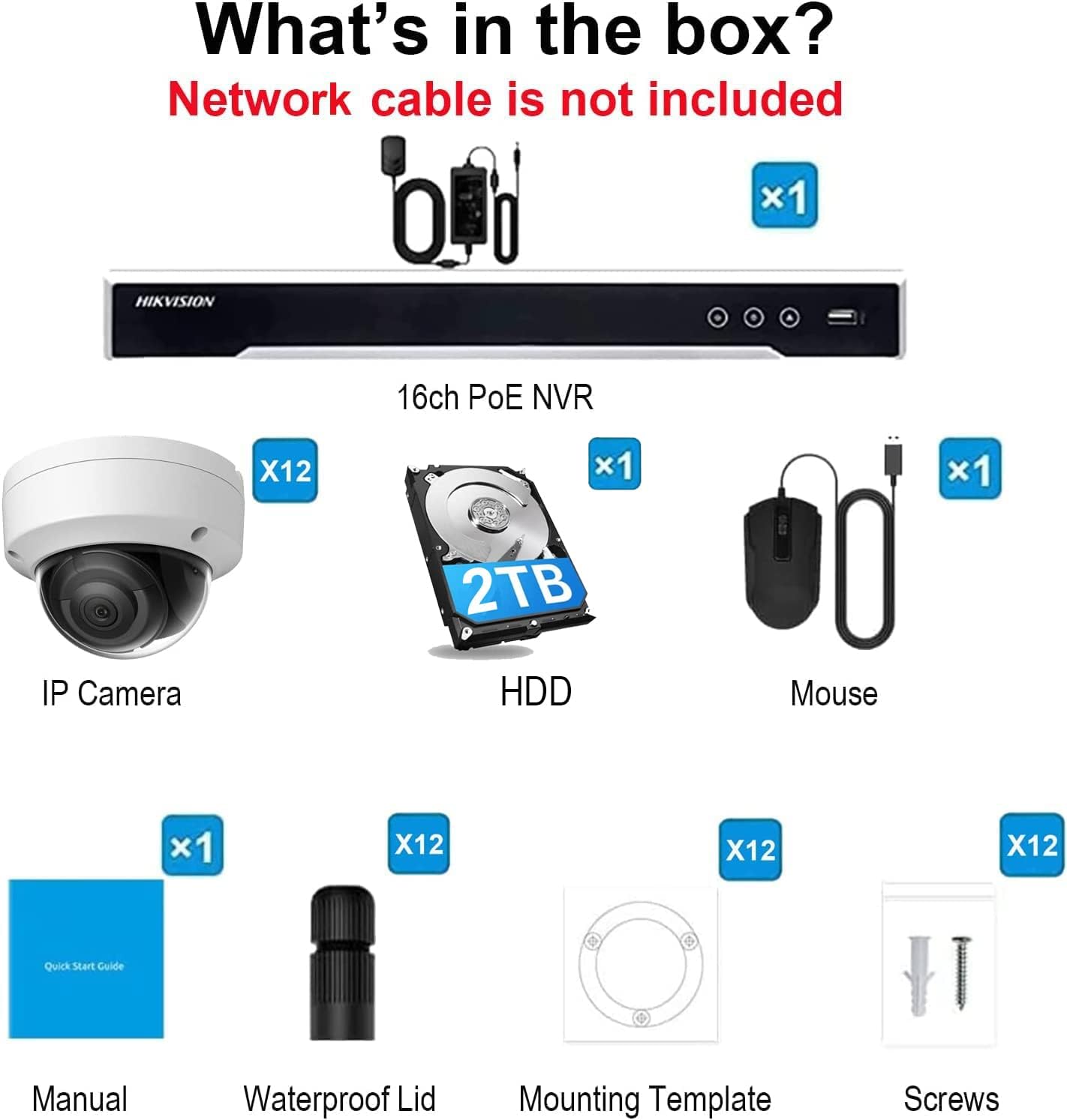 Compatible with Hikvision Security Surveillance IP Camera System, 12× DS-2CD2143G2-I (Replace DS-2CD2143G0-I & DS-2CD2142FWD-I) 4MP IR Dome IP Camera, 2.8mm Lens + DS-7616NI-Q2/16P 4K NVR POE H.265