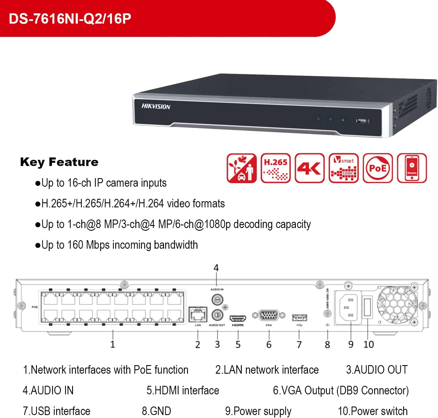 【4K 16CH PoE NVR + 12 PCS Digital camera】DS-7616NI-Q2/16P comes with a Pre-Put in 2TB Surveillance Onerous Drive, help as much as 8 megapixels decision recording. 1 HDMI and 1 VGA interfaces, each interfaces help impartial video output. 2 SATA interfaces for HDD connection (as much as 8 TB capability per HDD). Please discover that the exhausting driver is just not embody.As much as 160 Mbps incoming bandwidth. Plug-and-play with 16 energy over Ethernet (PoE) interfaces.