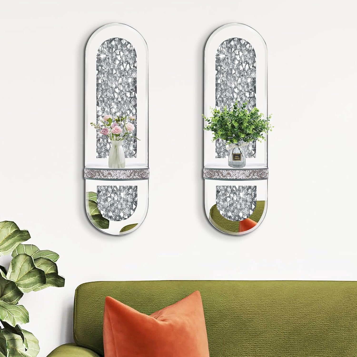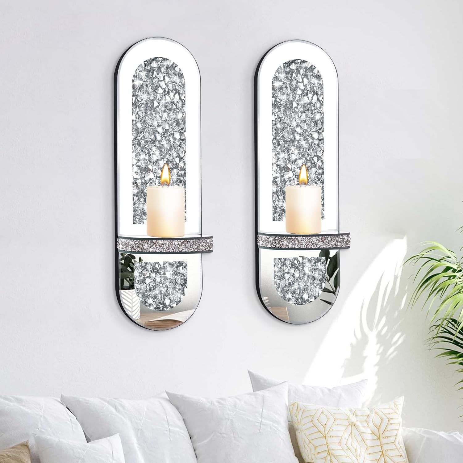 【EXCELLENT DESIGN】: Our mirrored wall sconces are available in a set of two. Every wall sconce is fitted with 4 hooks on the again of the sconce, and there are two methods to hold them, and alternative ways to hold them will current totally different results. The wall sconces are fashionable and chic, an ideal mix of silver mirrors, acrylic crushed diamonds, the perimeters of the candle holder trays are additionally inlaid with acrylic crushed diamonds, the silver end is each trendy and timeless, they convey simply the correct quantity of magnificence to any area, including immediate glamour and artistry.