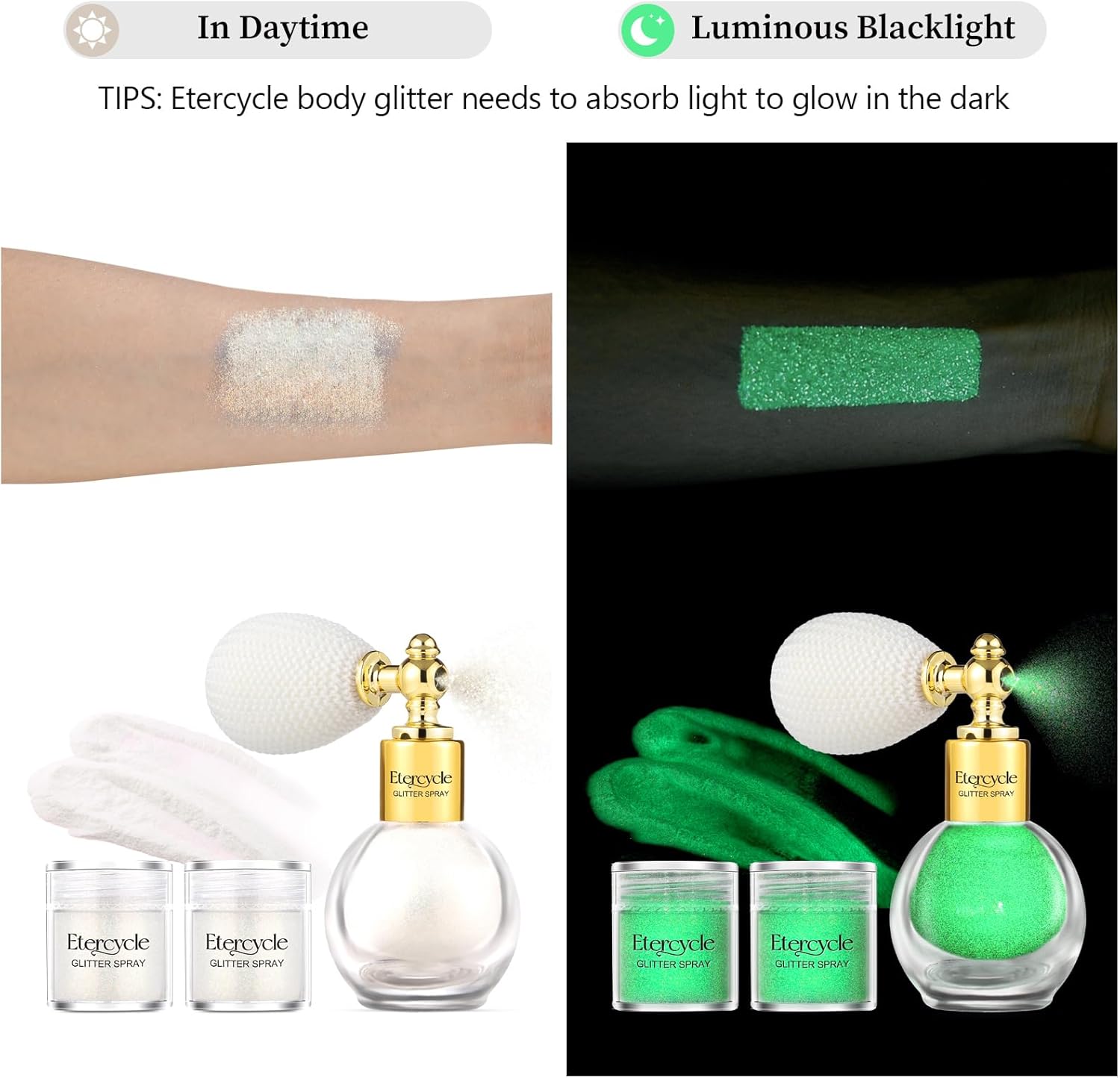 Essential Suggestions: All the time use UV mild to make sure luminous impact, synthetic seen mild can cost these glitters too, nevertheless it’s far more slowly.The Finest method and quickest method to cost these glitters are with a UV black mild.Ensure that to maintain your physique moist earlier than use, When you have a dry physique, you possibly can combine the glitter within the alternative pack with the physique lotion and apply it.Plus, our glitter fragrance could be simply cleaned with water or cleaning soap, guaranteeing utmost comfort for you