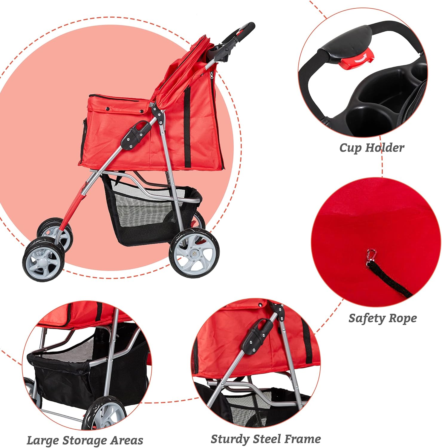 Folding Pet Stroller Elite Jogger Kitten Puppy Easy Walk Dog Cat Small Animals Travel Carrier with 360 Rotating Front Wheel red