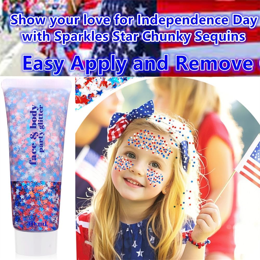 Go Ho self-adhesive physique glitter gel options daring purple, white, and blue laser star shaps sequins that shift in shade and shine from each angle. No glue is required—apply immediately with fingertips or a brush for vibrant, eye-catching designs on pores and skin, hair, or equipment, excellent for 4th of July festive celebrations.The sleek texture shields pores and skin from irritation whereas delivering daring, patriotic model, making it ideally suited for delicate areas or family-friendly occasions.