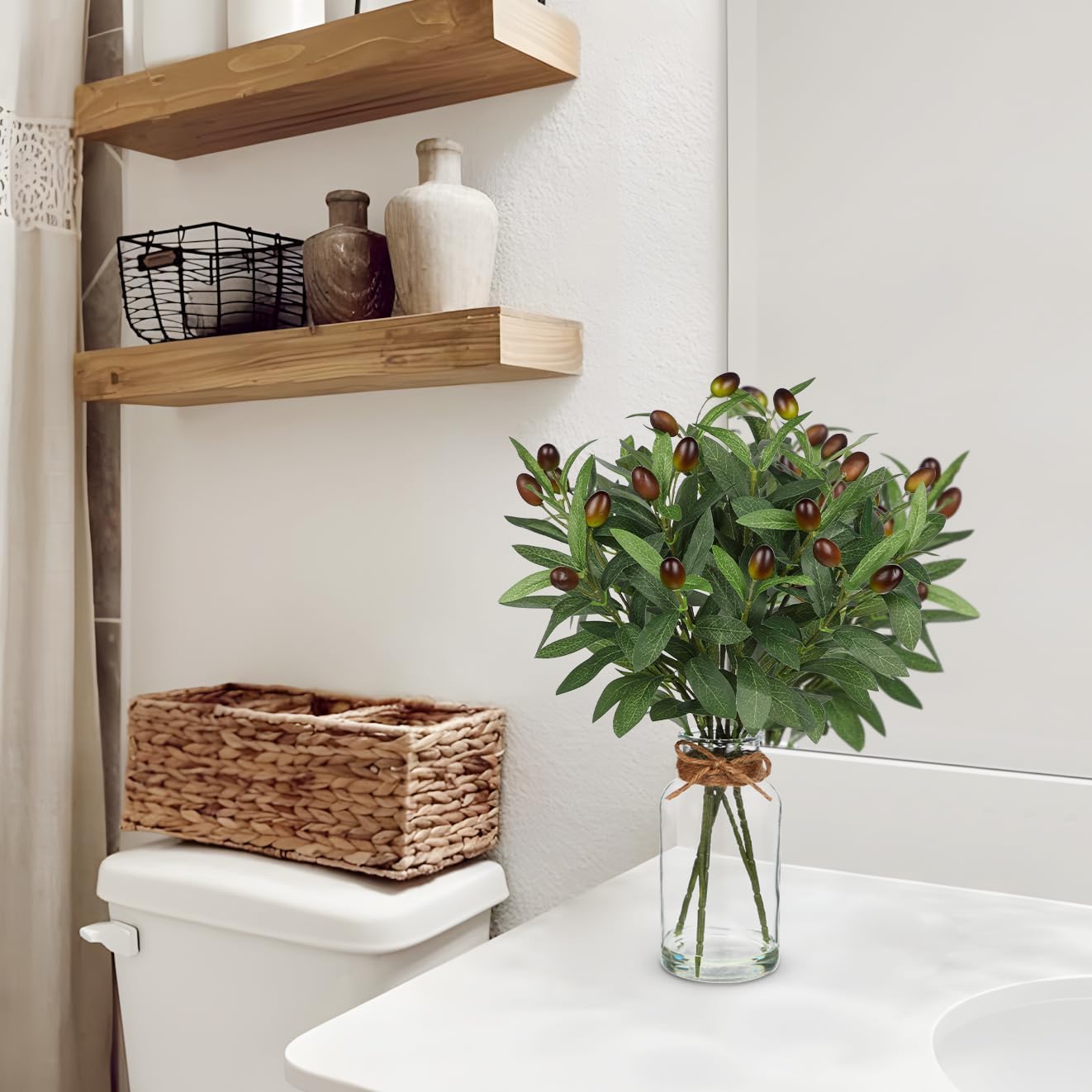 Materials: Our olive leaves are comprised of premium high quality plastic for a sensible appear and feel. The pretend olive department is positioned in a transparent glass vase with fake water. The fake water is a gel-like substance that mimics the look of water whereas holding the flower stems firmly in place. The vase can also be tied with a hemp rope, combining to create a classy and fashionable aesthetic that can elevate the decor of any room