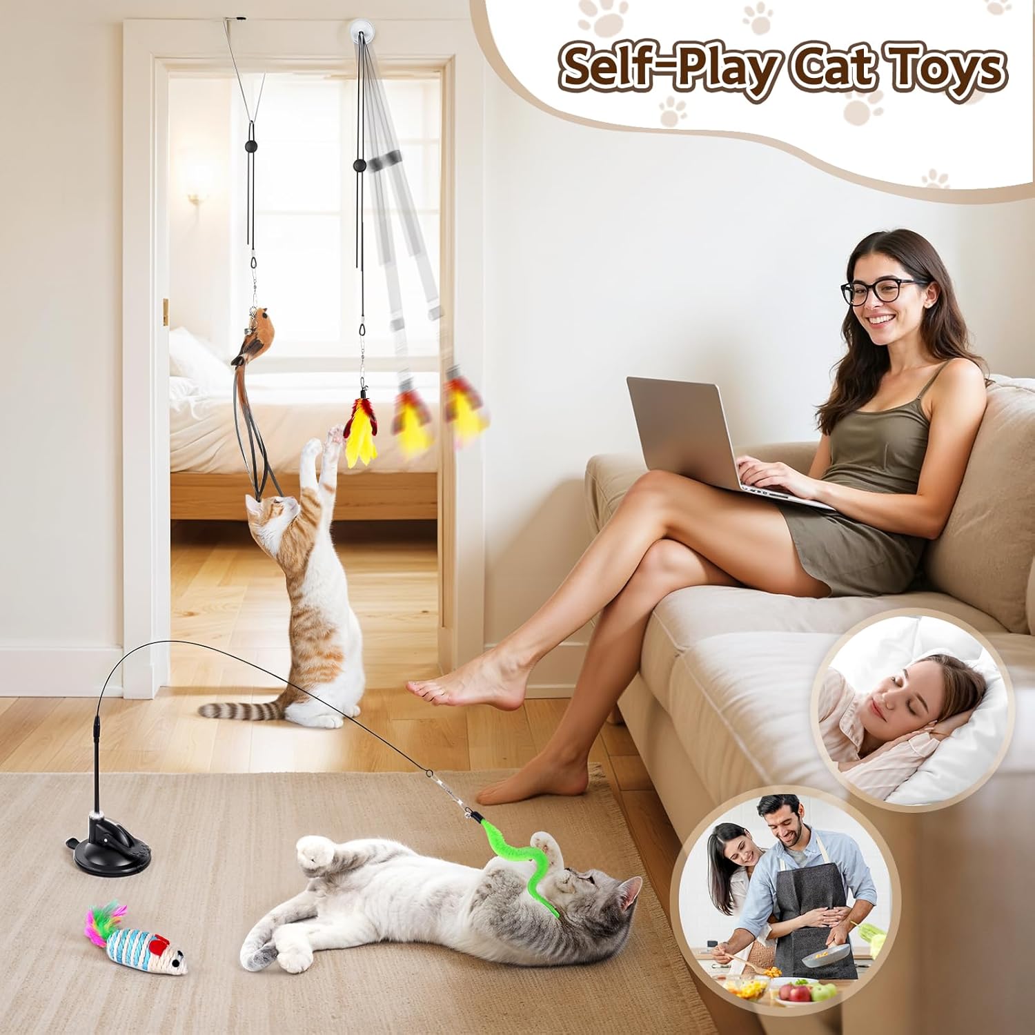 11 Pcs Flying Fowl Cat Toys: The set contains 1 single-head suction cup, 2 cat wands, 4 simulated chook toys, 2 feather toys, 2 worm toys, 1 butterfly toy, 1 mouse toy, 1 ribbon toy, 2 ropes, 2 sticky pads and 1 triangle clip. All components are removable and outfitted with beautiful bells, offering an ideal atmosphere simulation on your cat, stimulating the cat’s searching intuition, getting the cat to train, and serving to bored cats keep !