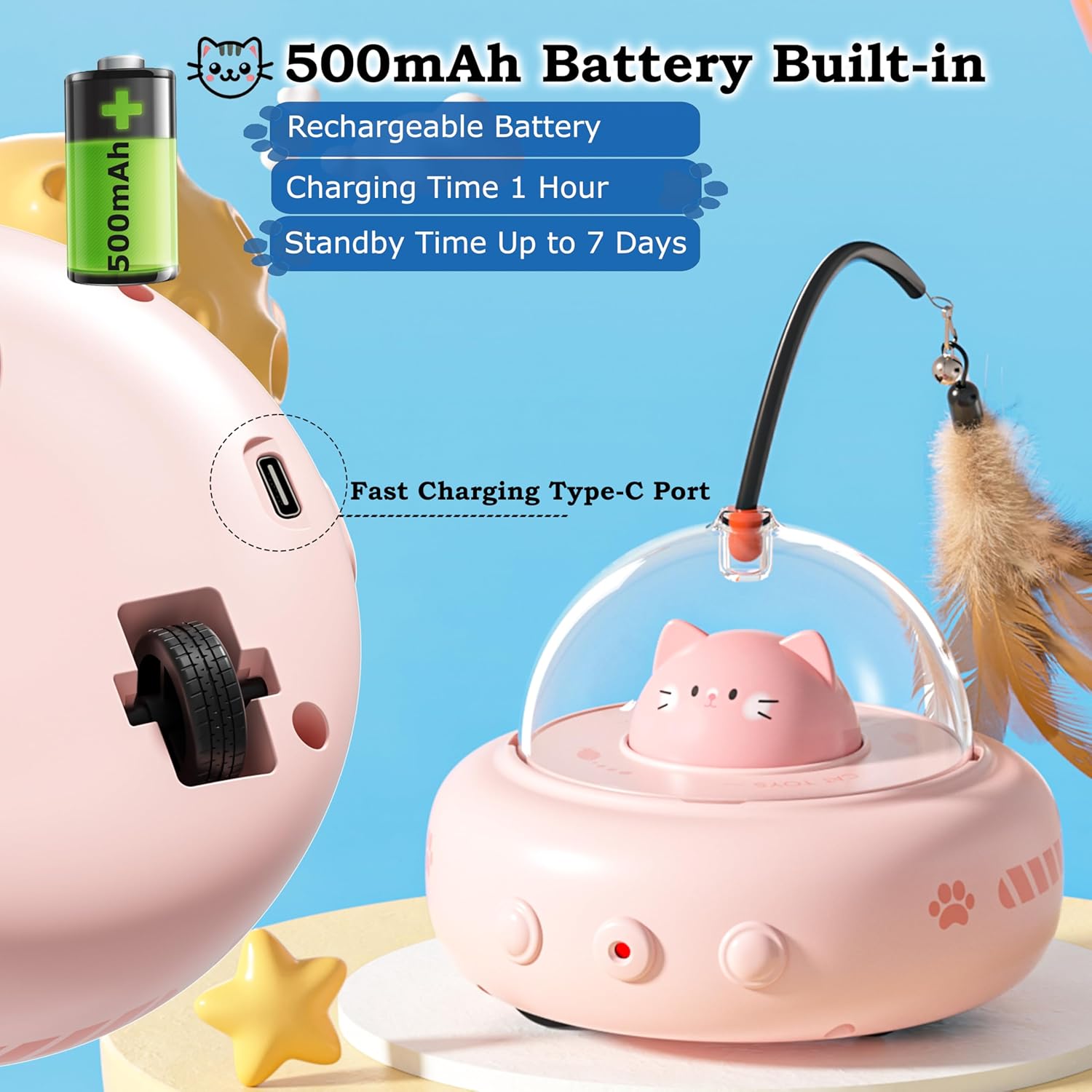 【Highly effective 500mAh Li-ion Battery】 Designed for long-lasting enjoyable, this high-capacity battery helps frequent play classes and stands by for as much as 7 days on a single cost. The conceal and search cat laser toy can be geared up with Kind-C quick charging, which may totally cost the facility in solely 2 hours.