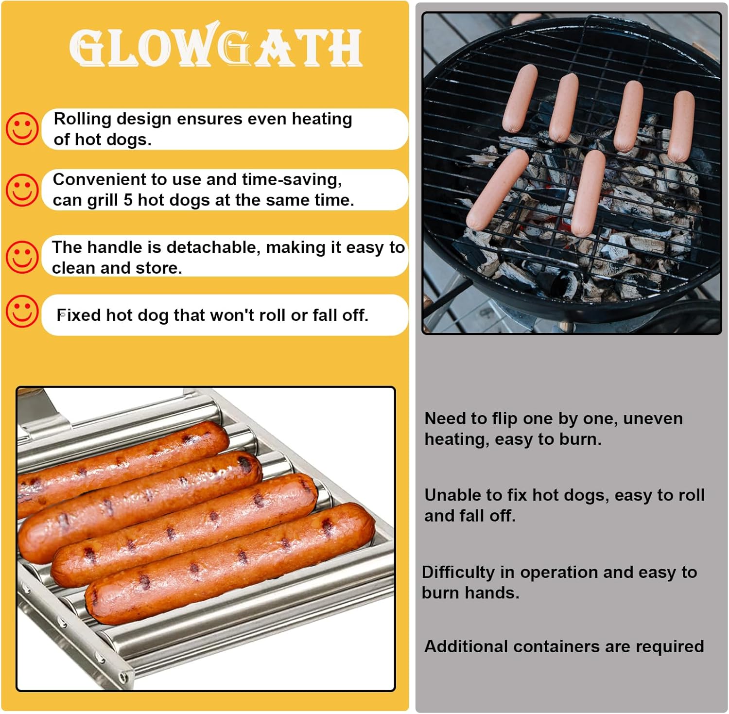 Grill as much as 5 scorching canine at a time. Clean rolling permits scorching canine to be grilled evenly with out burning.