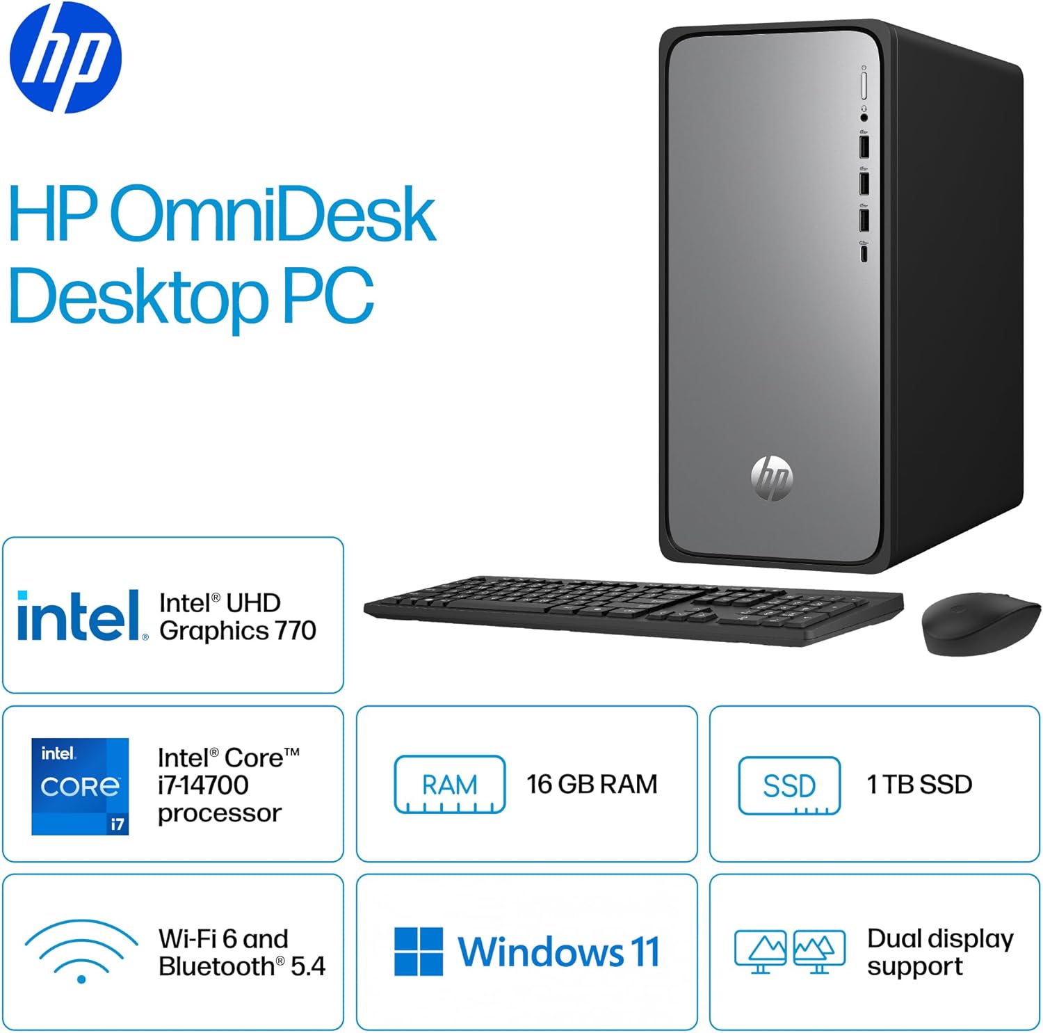 HP OmniDesk Desktop PC, Intel Core i7-14700, 16 GB RAM, 1 TB SSD, Intel UHD Graphics 770, Windows 11 Home, Microsoft Copilot, Meteor Silver, M02-0110 (2025)
