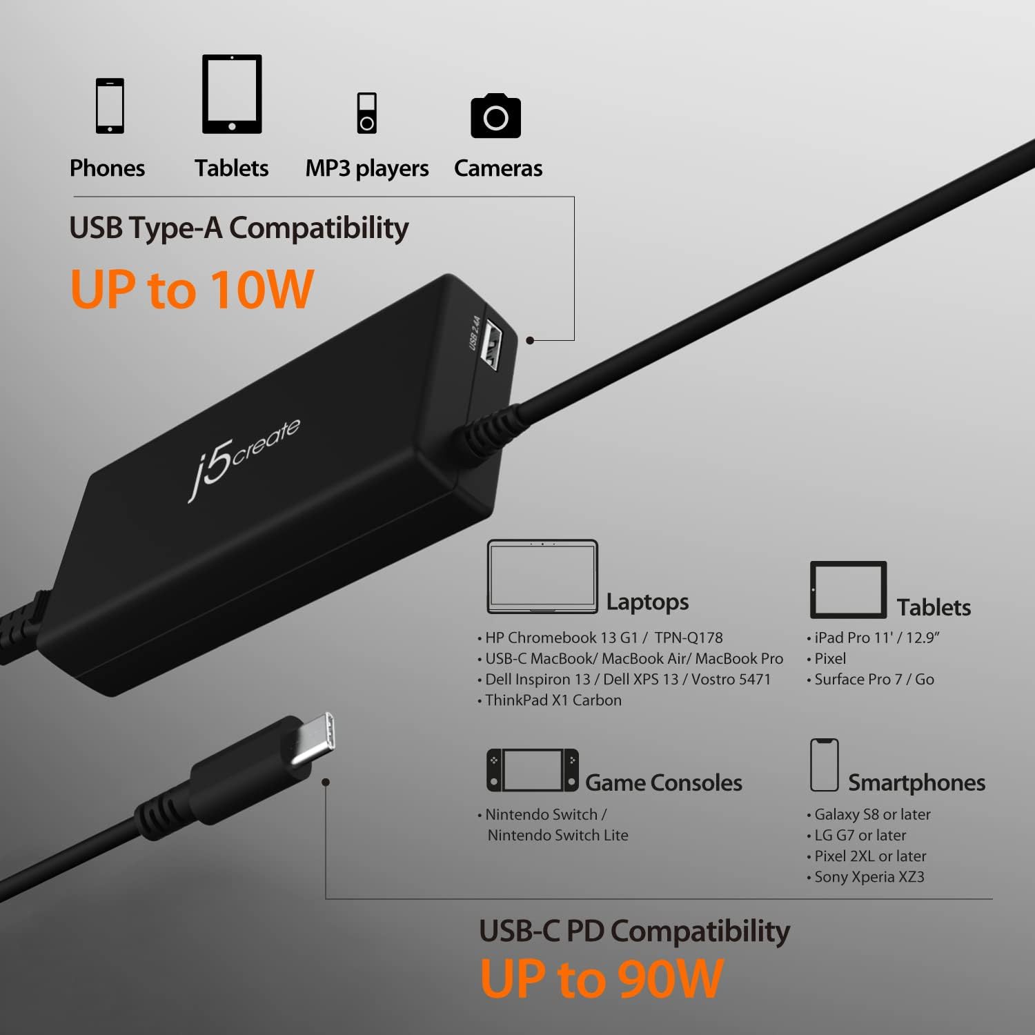 j5create USB Type C Super Charger PD 90W + USB Type A 10W Fast Charging for Chromebook, Laptop, MacBook Pro 13” (JUP2290C)