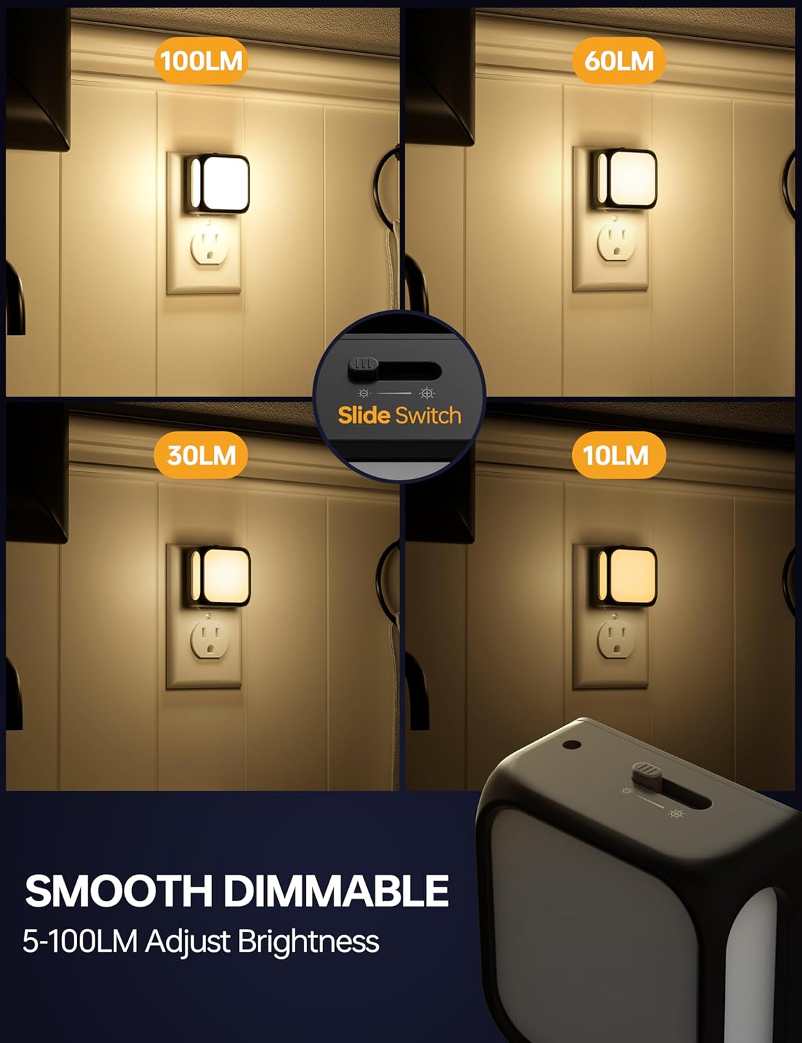 Stepless Adjustable Dimmable: LED night time gentle includes a easy dimming expertise that enables any degree (5% – 100%) brightness. The brightness degree might be adjusted by sliding the button positioned beneath the twilight sensor, making certain handy and exact management in accordance with private preferences or environmental situations