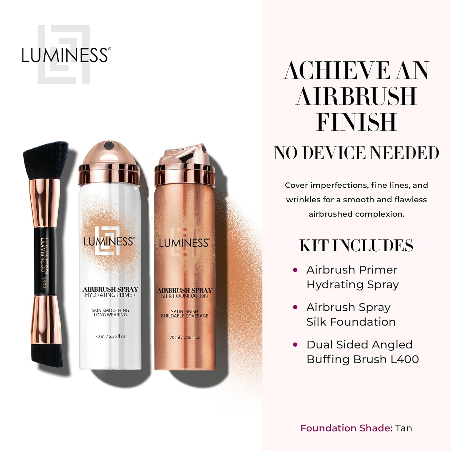 Flawless Complexion: Cowl imperfections, superb strains and wrinkles with the LUMINESS Airbrush Spray Silk Basis Starter Equipment. Obtain an airbrushed look with primer and basis spray formulated with hydrating components to replenish and lock in moisture. Consists of 1 Hydrating Primer, 1 Silk Basis, and 1 Twin Sided Angled Buffing Brush L400. Basis Shade: Tan