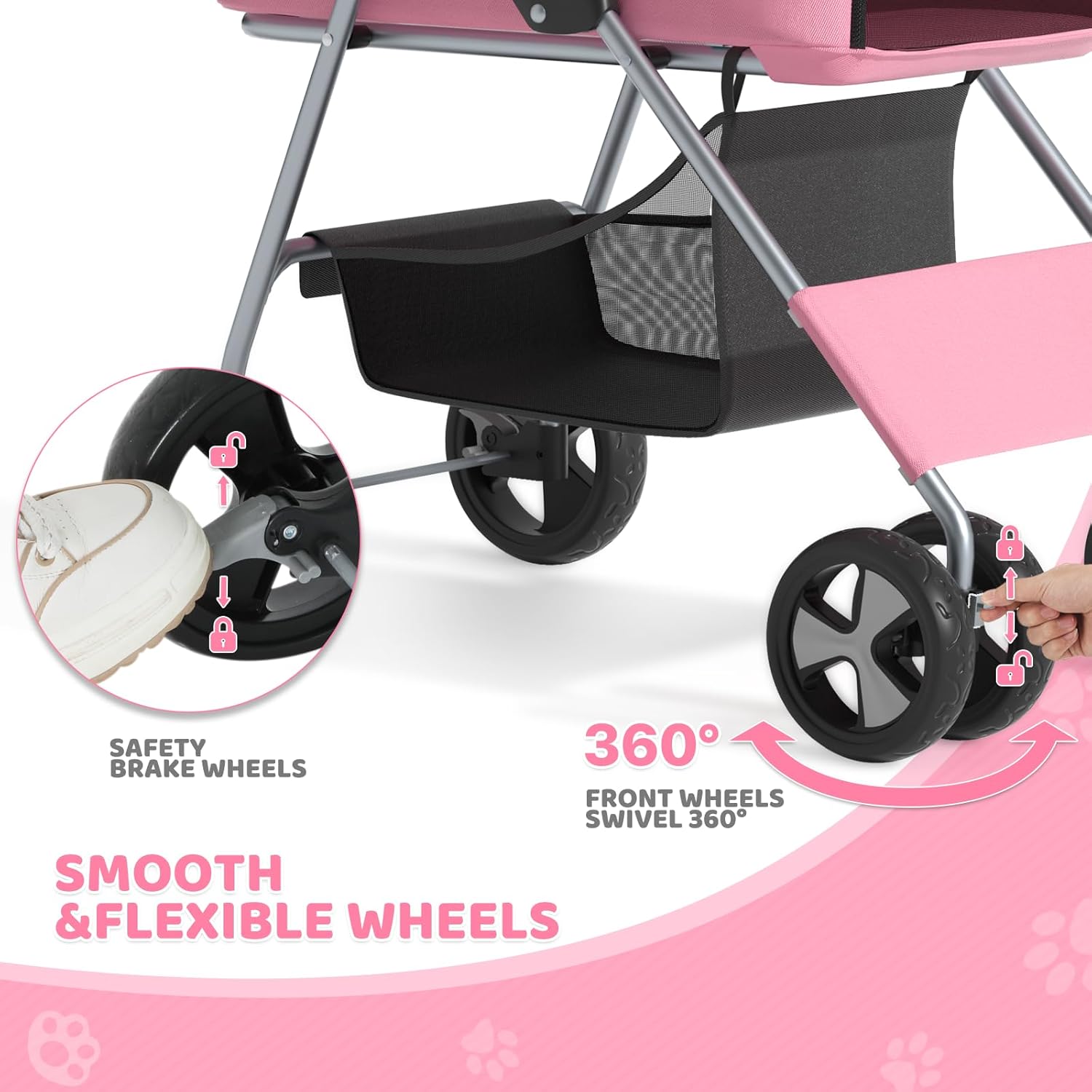 Superior Wheel Suspension, Braking & Security System: Designed for stability, maneuverability, and management, our pet stroller options 360° swivel entrance wheels for easy navigation, whereas the shock-absorbing rear wheels guarantee a easy, secure experience on numerous terrains. For added security, the twin rear-wheel braking system supplies a safe cease on slopes and uneven surfaces, giving pet house owners peace of thoughts throughout strolls
