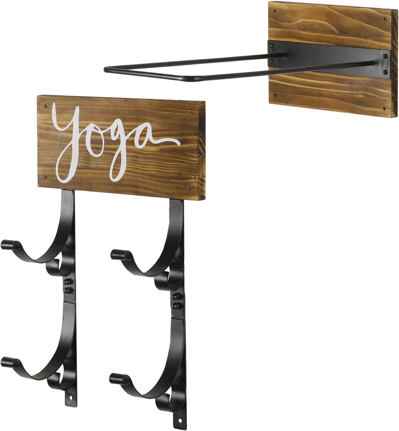 MyGift Yoga Mat and Stability Ball Holder – Rustic Burnt Wood and Black Metal Wall Mounted Exercise Yoga Equipment Organizer, 2 Pc Set