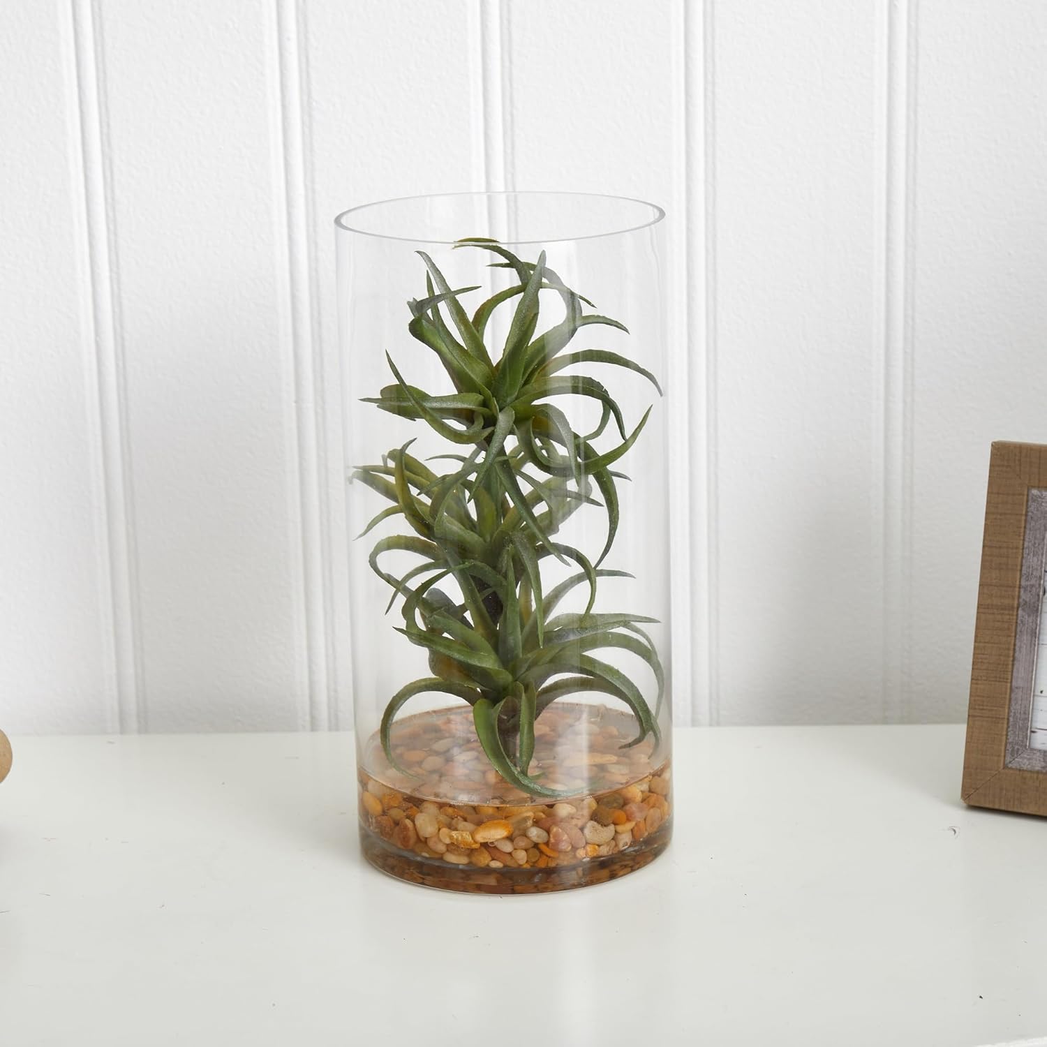 Pure in look, this 12-inch air plant synthetic succulent options inexperienced foliage that spirals upward inside a transparent cylinder vase. With fake water and pure river rocks that sit on the base of the plant, it will deliver a beautiful desert oasis really feel into your lounge when positioned on a mantelpiece alongside different succulent vegetation bundled with in clear or flippantly tinted inexperienced vases for an entire look.