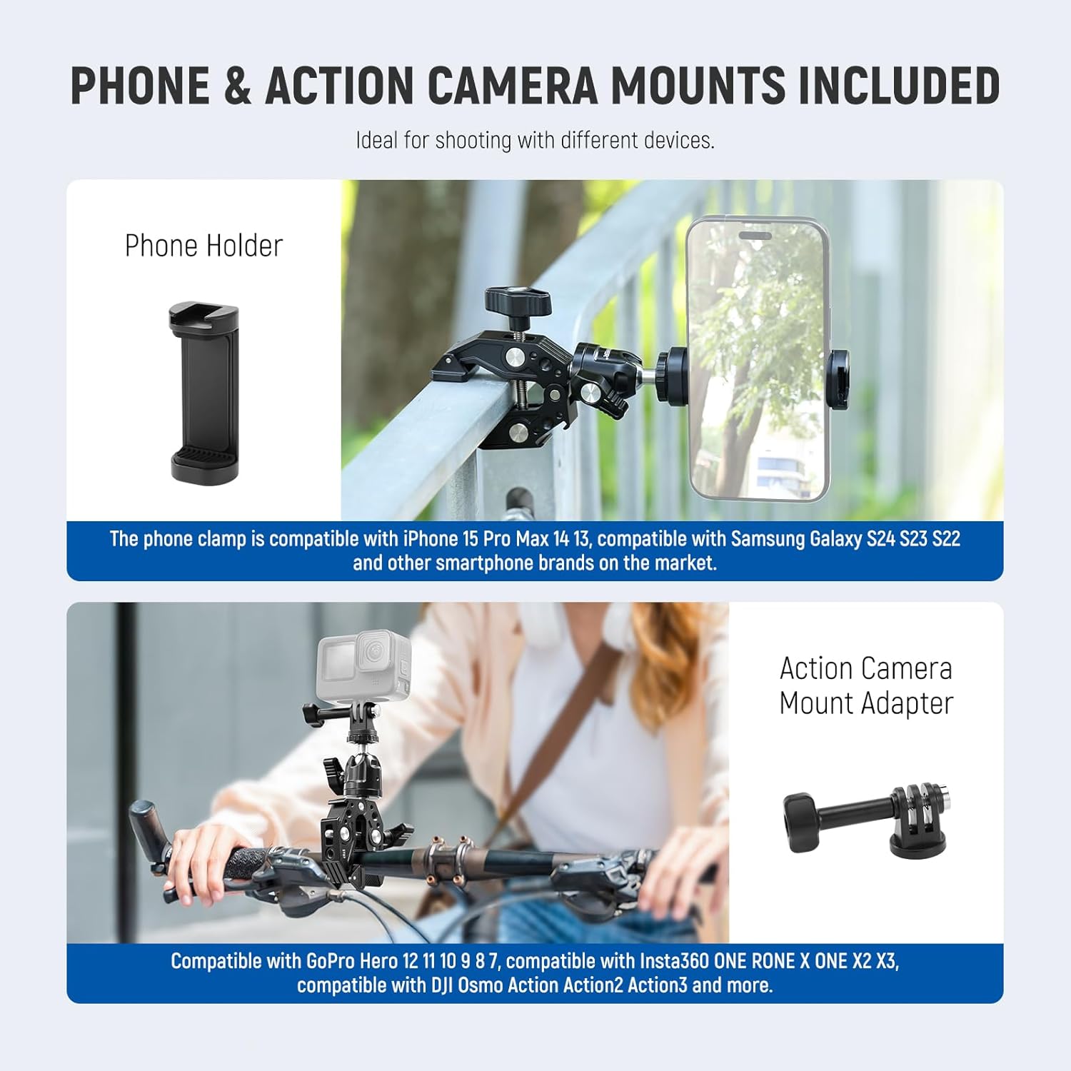 【For Motion Digicam/Smartphone】The common motion digital camera mount adapter is appropriate with GoPro Hero 12 11 10 9 8 7, appropriate with Insta360 ONE RONE X ONE X2 X3, appropriate with DJI Osmo Motion Action2 Action3, and so on. A 2″-3.3″ (5-8.5cm) adjustable telephone clamp is appropriate with iPhone 15 Professional Max 14 13, appropriate with Samsung Galaxy S23 A22 and different smartphone manufacturers available on the market