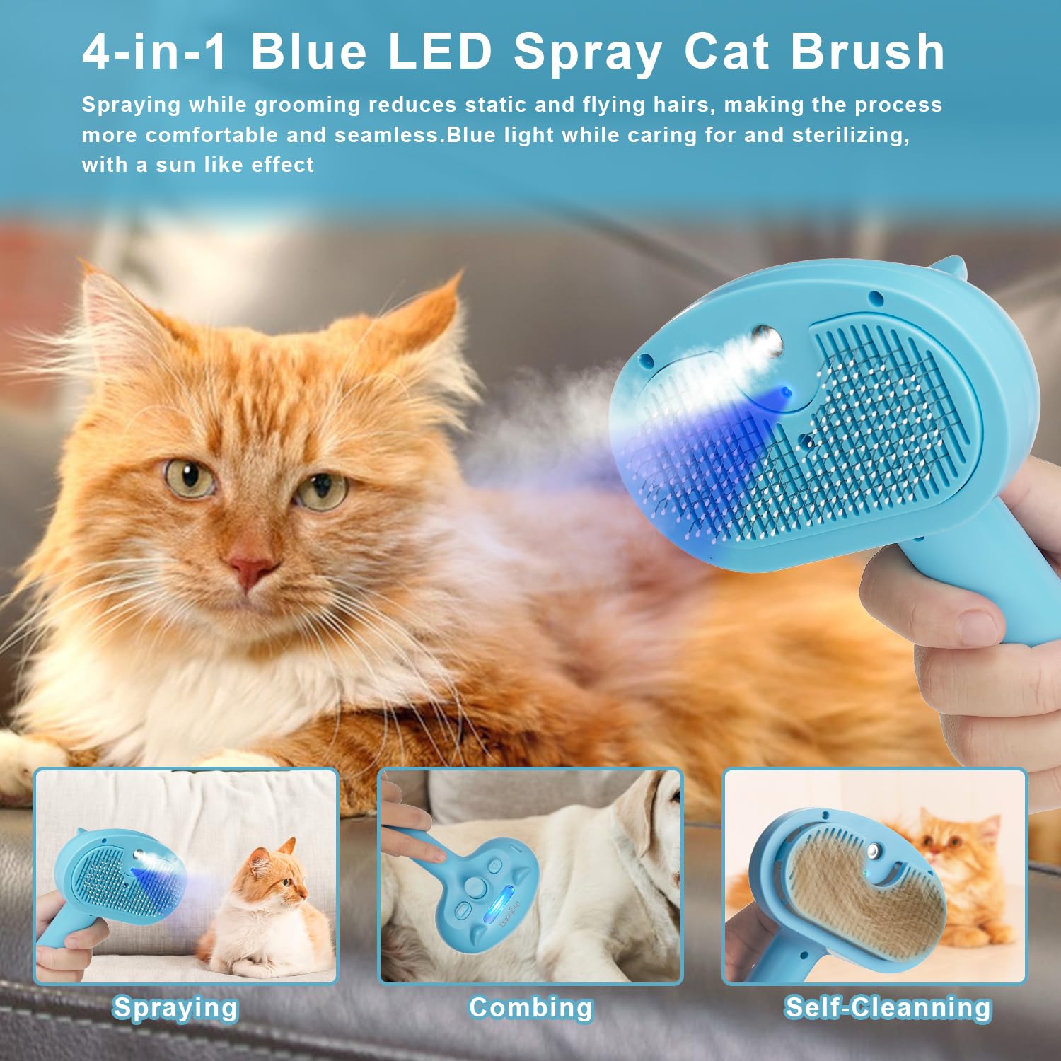 Spray Cleansing: Outfitted with a water tank and LED blue mild, the comb gently Spray and loosens cussed pet hair for easy grooming.the LED blue mild sterilization and disinfection