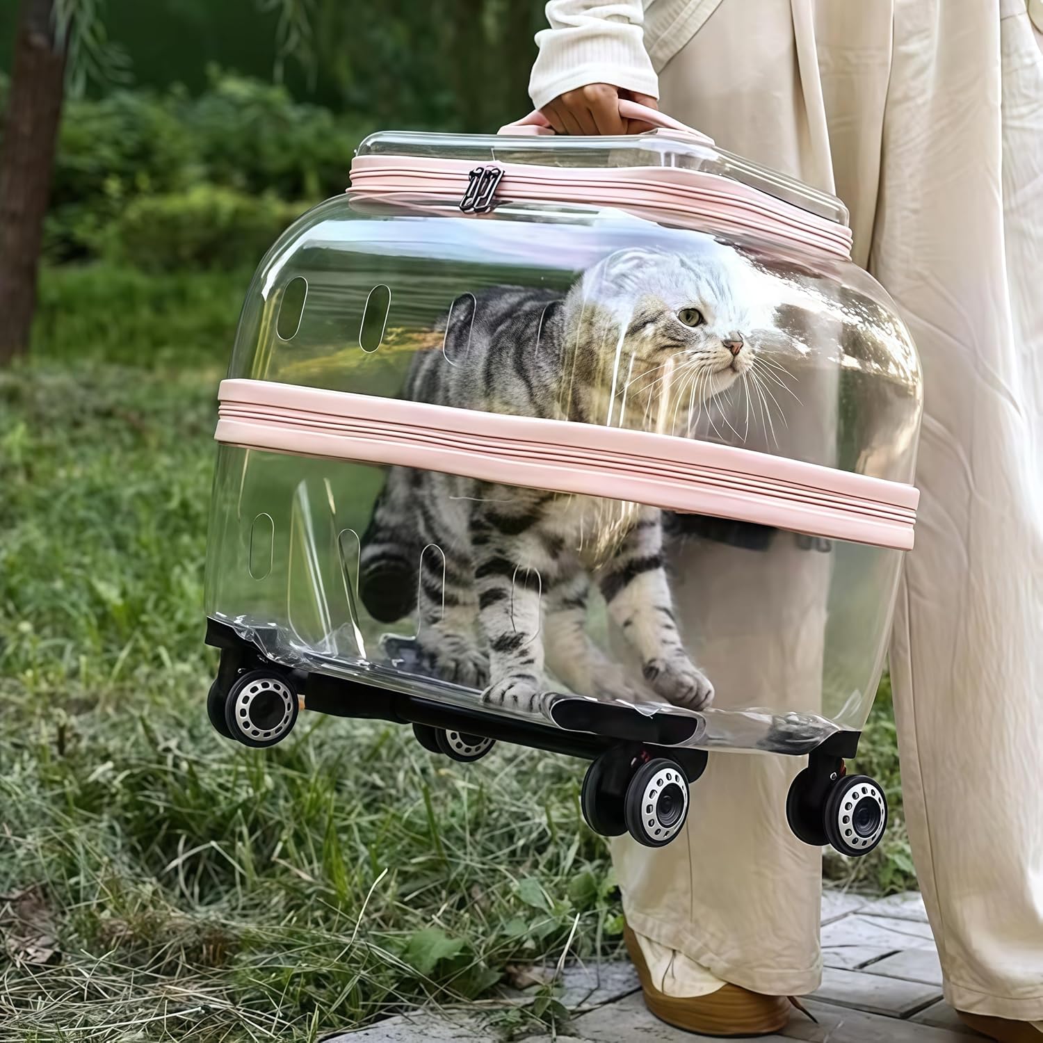 Journey along with your feline good friend in fashion and luxury with this revolutionary pet provider that includes a telescopic deal with and smooth-rolling wheels. The spacious design, measuring 18.9 x 13.8 x 18.1 inches, supplies ample room in your cat to maneuver round comfortably. The clear partitions permit your pet to look at their environment whereas staying safe inside. This provider combines performance with trendy design, that includes a rose gold trim and sturdy development. The air flow holes guarantee correct airflow, whereas the sturdy wheels make transportation easy. Excellent for vet visits, journey, or any event when it’s good to transport your cat. The highest-loading design makes it simple to put your pet inside, and the safe zipper closure retains them safely contained. The provider’s strong development and high quality supplies guarantee stability throughout motion, whereas the ergonomic deal with supplies snug maneuvering. Very best for cats of assorted sizes, this provider transforms pet transportation from a problem right into a handy expertise.