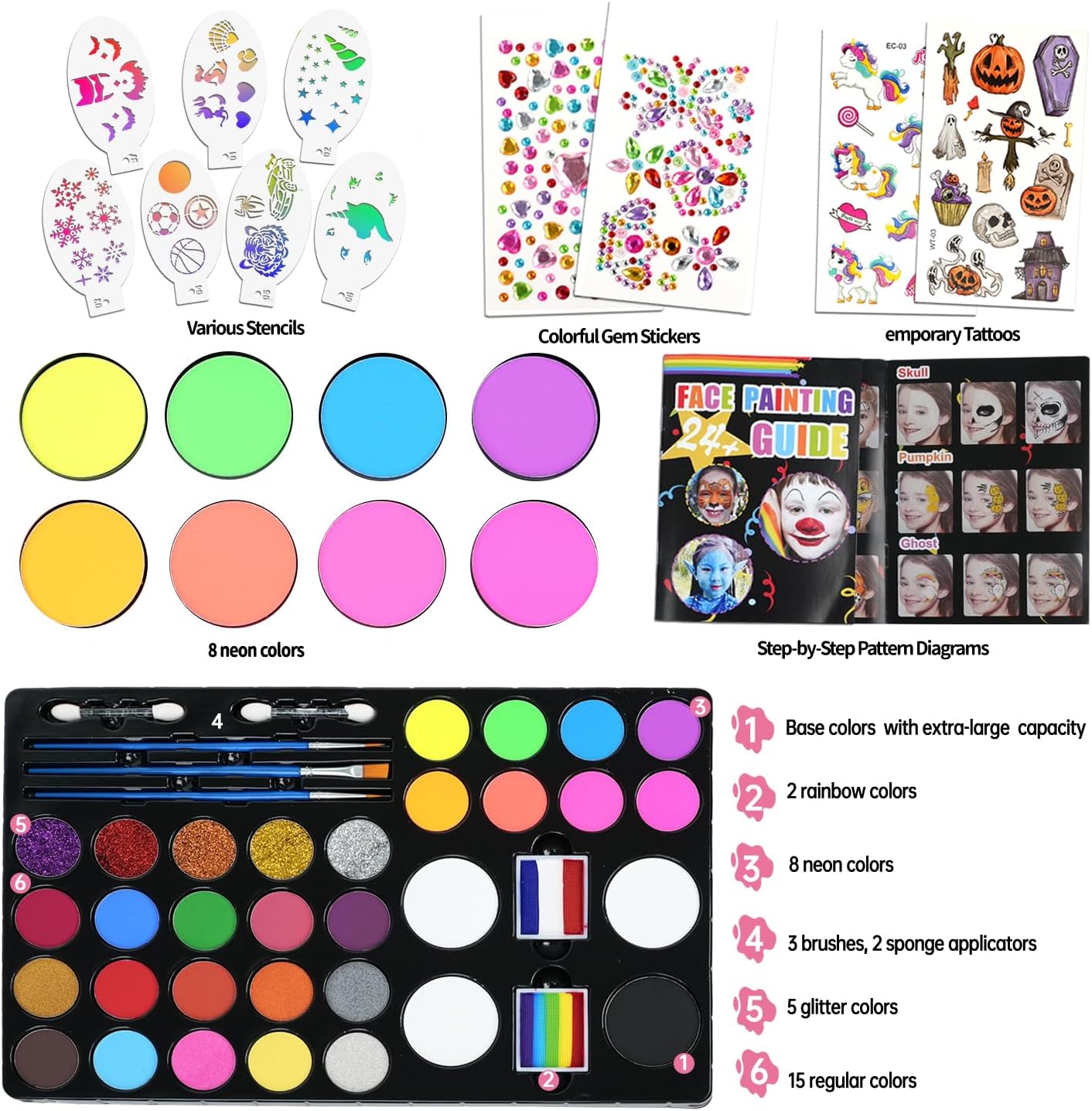 Wealthy facial portray equipment: This facial portray equipment consists of 32 colours and 17 equipment, with 15 common colours, 8 neon colours, 5 sparkle colours, 2 rainbow colours, and 4 giant plates of black and white colours. The equipment embrace a complete portray guidebook, 2 diamond stickers, 2 tattoo stickers, 3 brushes, and seven portray stencils. This set of instruments may help you simply draw numerous patterns and create limitless enjoyable