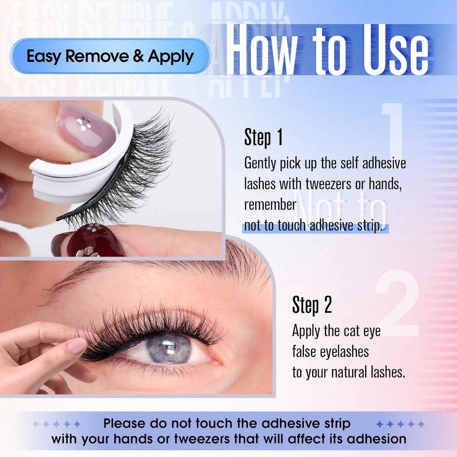 【Stick on Lashes with Extremely Simple-application】Simply 2 steps: take away and apply!Gently choose up the wispy self adhesive lashes with tweezers, keep in mind to not contact adhesive strip. Then,apply the cat eye false eyelashes to your pure lashes. If you wish to substitute the adhesive strip with new one,it is best to use tweezers to peel off used adhesive strip then maintain our strip faux lashes to the brand new adhesive strip.