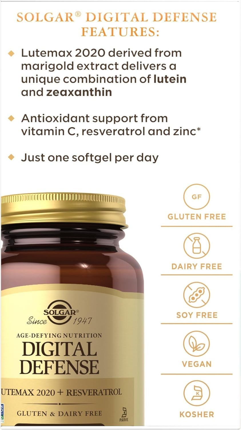 Solgar’s Age-Defying Digital Protection can assist to enhance visible efficiency and restoration response to shiny lights and glare in our screen-centric world*. Serving to to filter out blue mild and enhance eye well being when utilizing digital gadgets similar to computer systems, sensible telephones and tablets*. It’s essential to guard your eyes, and this distinctive formulation supplies Lutemax 2020 (derived from marigold extract) a novel mixture of lutein and zeaxanthin, together with Antioxidants Vitamin C, Zinc and Copper. Only one softgel per day, Digital Protection helps to cut back occasional complications related to eye pressure from blue mild and scale back occasional emotional stress*. *These statements haven’t been evaluated by the Meals and Drug Administration. This product is just not supposed to diagnose, deal with, remedy or forestall any illness