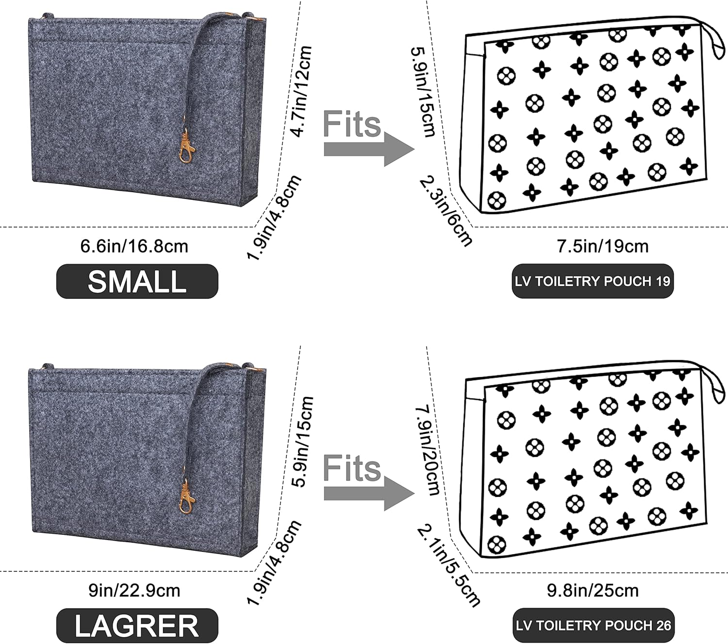 【SIZE OF FELT BAG ORGANIZER】Small Measurement-6.6 (L) x 4.7 (H) x 1.9 (D)inches matches for Toiletry pouch 19; Giant Measurement-9 (L) x 5.9 (H) x 1.9 (D) inches matches for Toiletry pouch 26. Transportable and Compact Purse can also be completely for different model bag organizer.