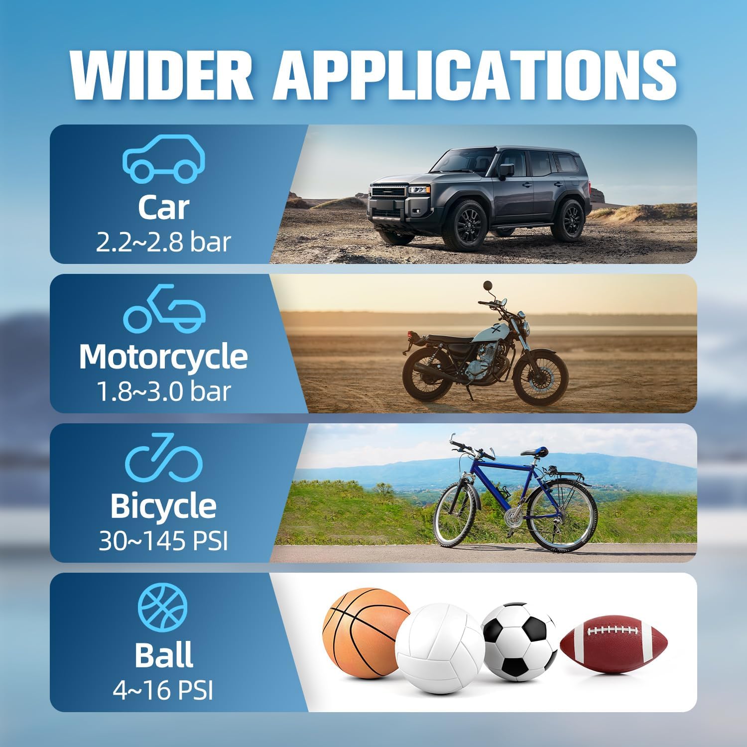 Good Auto-Shutoff Operate: Press the “Begin” button and the air compressor transportable will robotically inflate in line with your preset goal strain. When the set strain worth is reached, it can robotically cease inflating. The tire inflator supplies 4 sensible inflation modes (automobile, bike, bicycle, ball) and customized mode, and 4 inflation items (PSI, Bar, kPa, kg/cm²) so that you can select