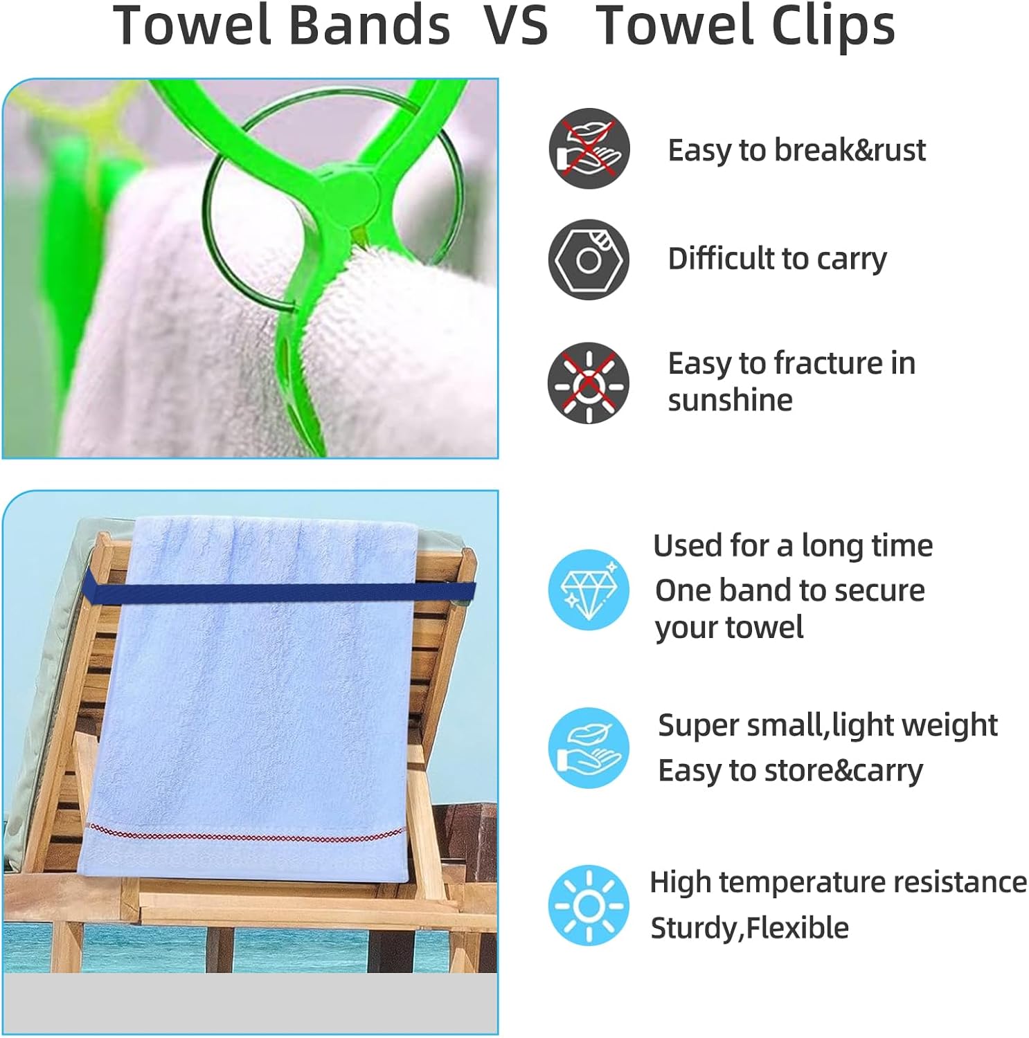 【Elastic Towel Bands】Seaside chair towel bands are manufactured from rubber and polyester that are proof against bending and breaking within the solar.No extra fear about them breaking or rusting, you need to use them simply and comfortably and stop towels slippage.