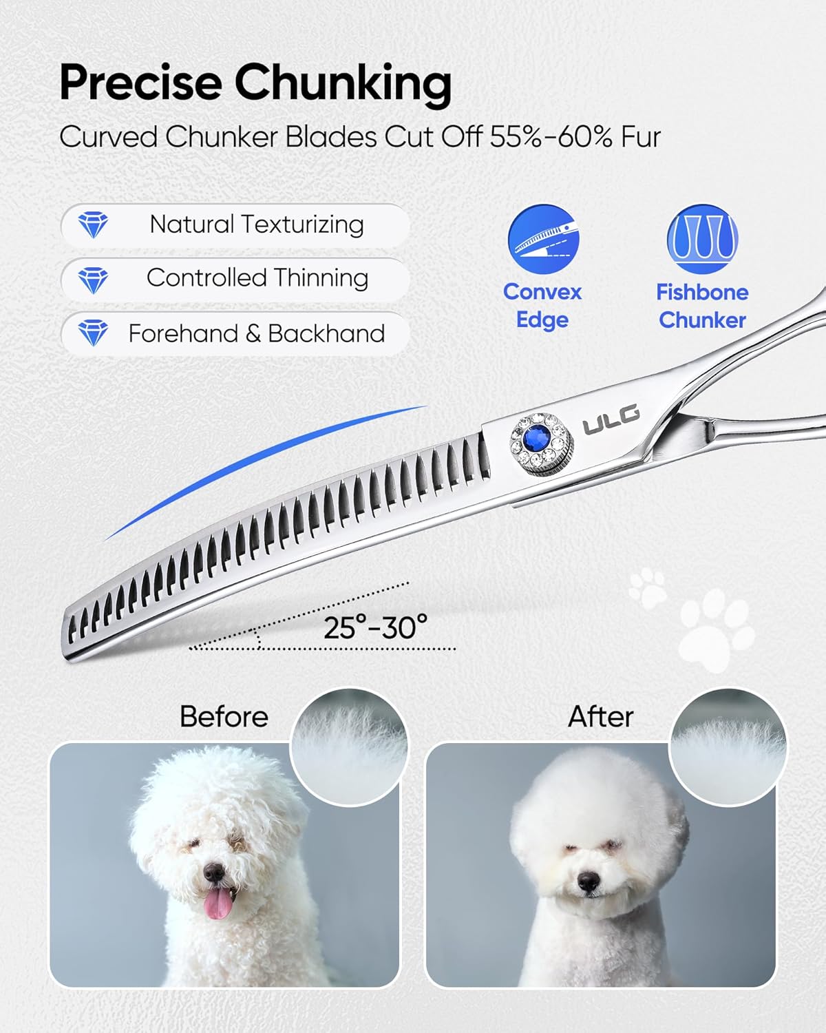 Premium Materials: Constructed from Japanese chrome steel. The chunker shears for grooming is razor-sharp, sturdy, and clog-free, guaranteeing easy, exact cuts by thick fur and cussed tangles.