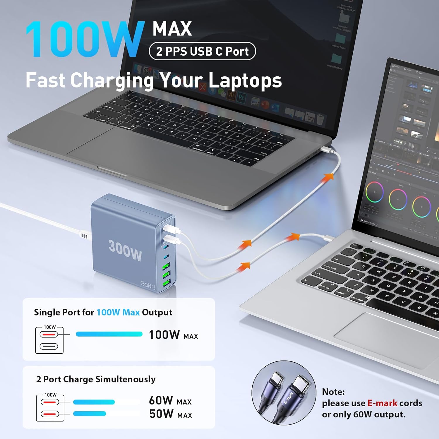 Twin 100W Laptops Charger: Our usb charging station has 2*100w PPS PD charger ports to cost two laptops on the identical time. You should use it to cost MacBook Professional 13”/15”/16″, Macbook Air 13”/ 12”, DELL, HP at a excessive charging pace. Use one 100W charging port to get a full pace of 100W, and it might probably cost your Macbook professional 16’’ to 50% in simply half an hour. Notice: if you happen to use two 100W charging ports to cost 2 laptops on the identical time, two laptops will get simply 65W wattage every.