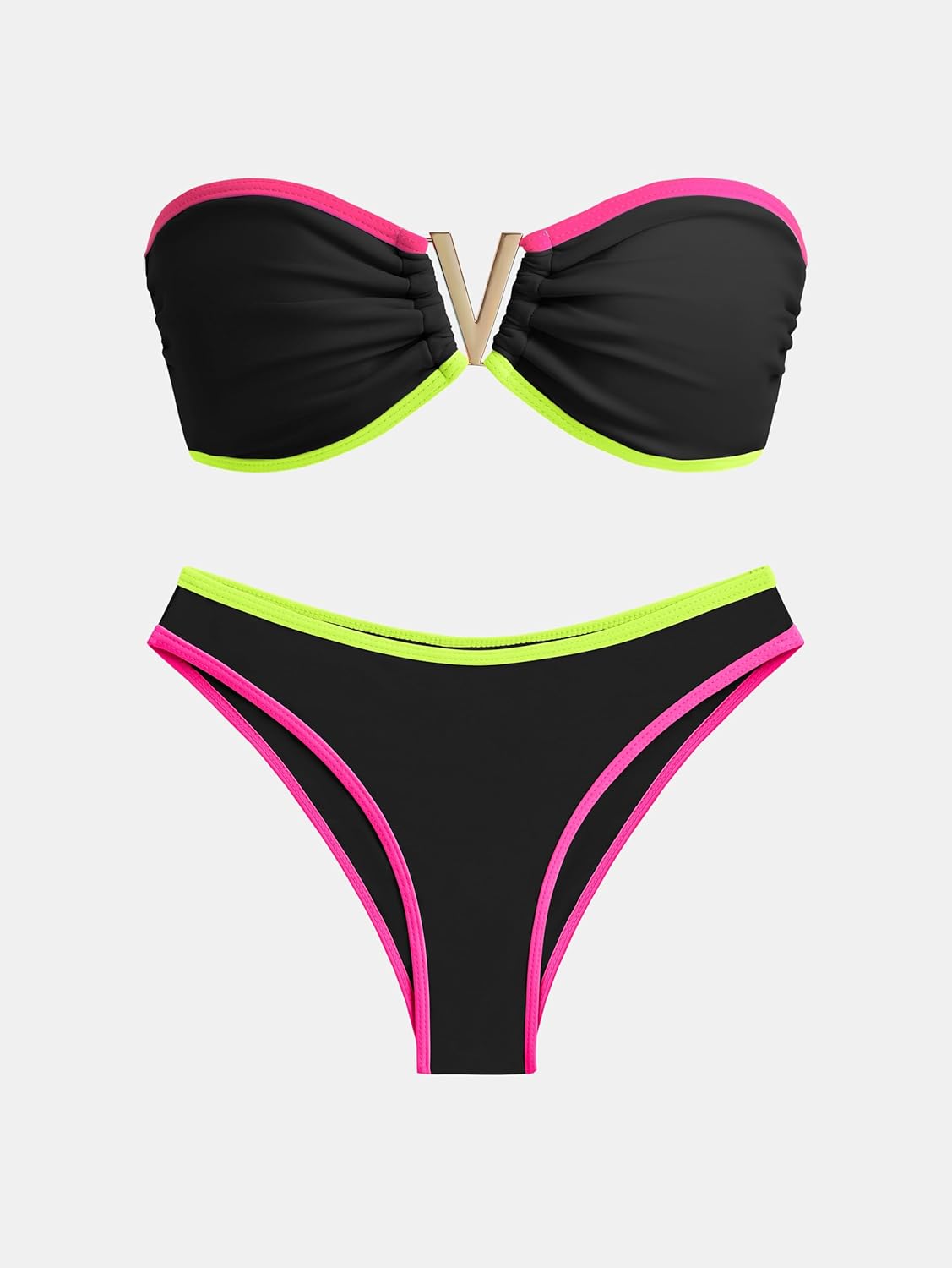 Ladies’s Bandeau Bikini V Strapless Confetti Colorblock Tie Again Excessive Lower Bikini