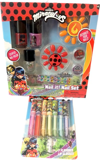 Zag Miraculous Ladybug Nail Polish Set and Lip Gloss Bundle- Includes 3 Nail Polishes, 2 Glitter Pots, 20 Faux Nails and Gemstone Sticker Sheet with 7 Flavored Lip Glosses, Medium