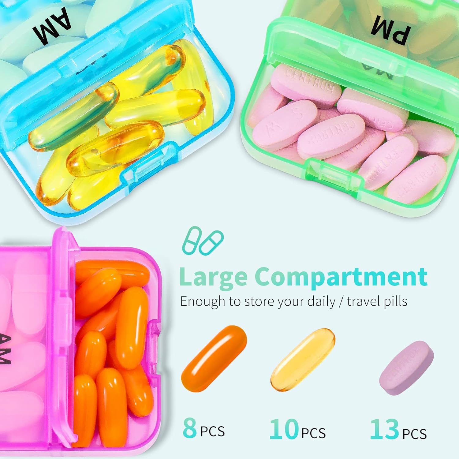 Clients discover the tablet organizer spacious, accommodating massive fish oil capsules, and recognize its sturdy development that is safer than common bins. The organizer is handy for day by day use and journey, being straightforward to hold in purses and suitcases, whereas the color-coded compartments assist with remembering days. They like its performance, notably throughout journey, and discover it efficient for organizing nutritional vitamins and dietary supplements.